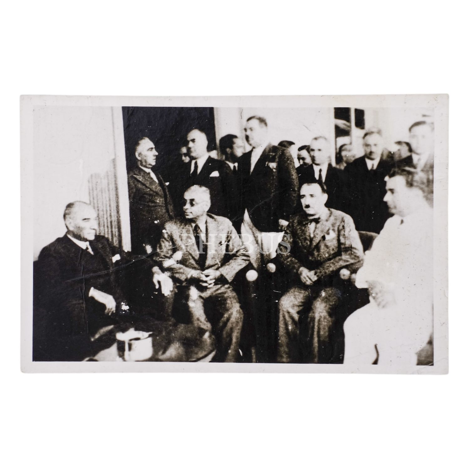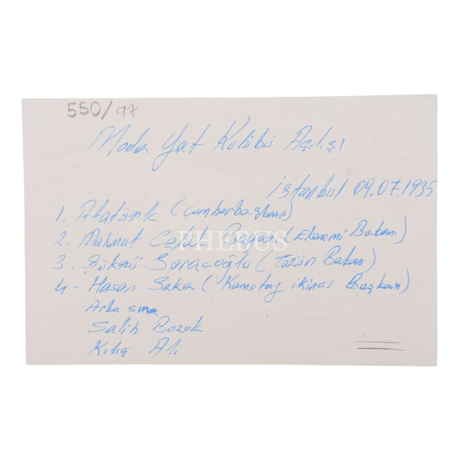 Mustafa Kemal Atatürk, Celal Bayar, Şükrü Saraçoğlu, Hasan Saka, Kılıç Ali ve Salih Bozok, Moda Yat Kulübü açılışında, 9 Temmuz 1935, 14x9 cm...