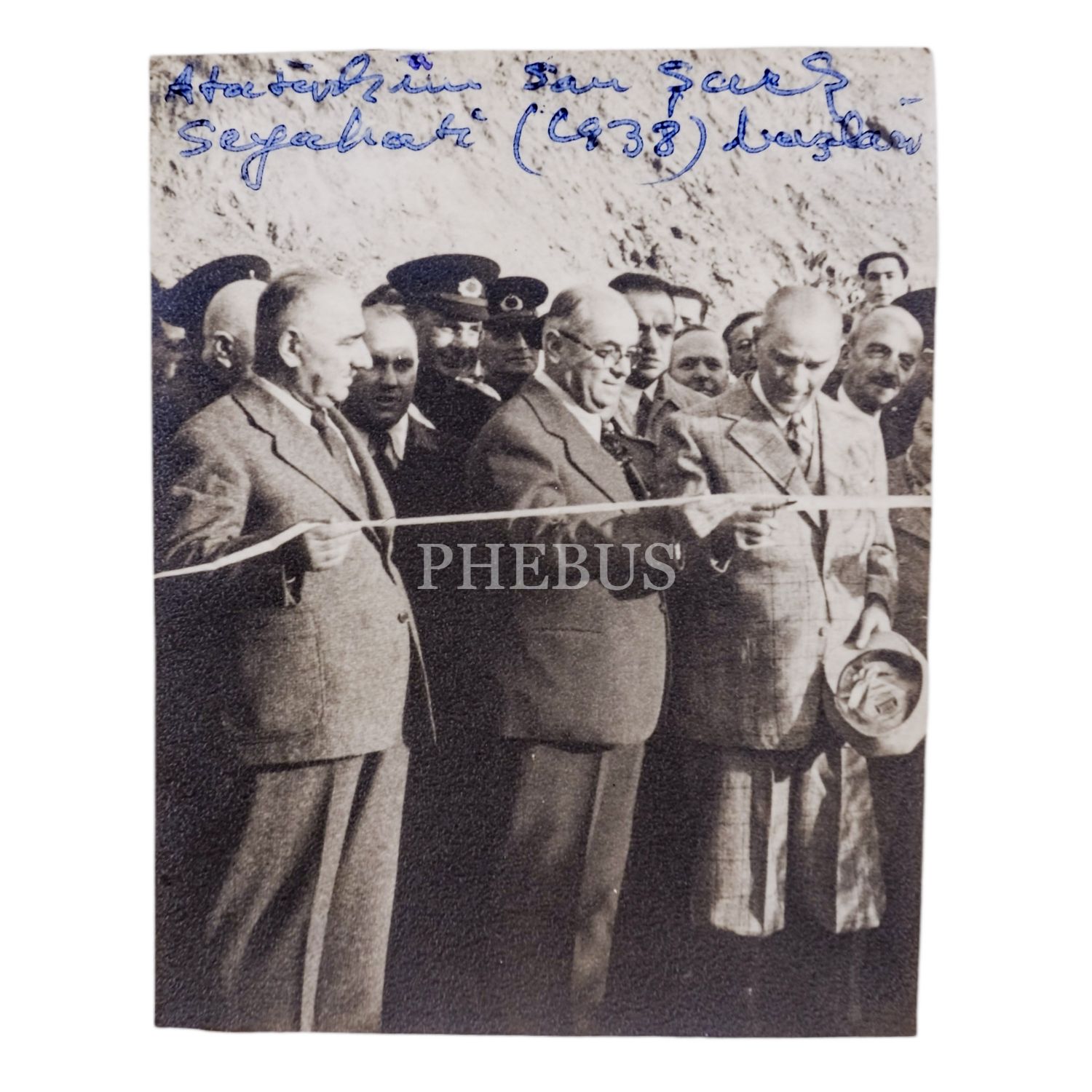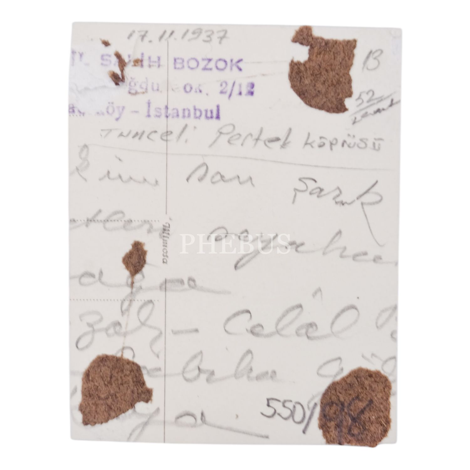 Mustafa Kemal Atatürk, 1938 yılının başlarında çıktığı Doğu gezisi kapsamında uğradığı Tunceli´de, Celal Bayar ve Salih Bozok ile birlikte Pertek Köprüsü´nün açılışında, ön ve arka yüzüne el yazısı açıklamalar düşülen fotoğrafın arka yüzünde "Salih Bozok" isminin geçtiği bir damga mevcuttur, 6x7 cm...