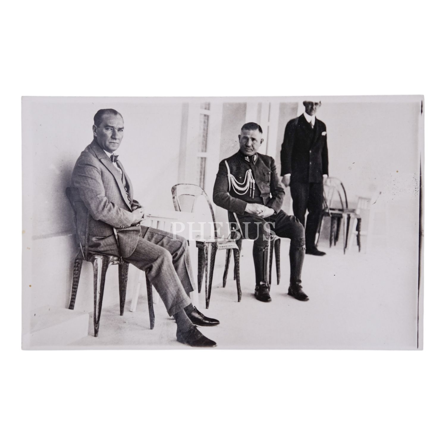 Mustafa Kemal Atatürk, yaveri Rüsuhi Savaşçı ve Ali Çavuş ile birlikte Gazi Orman Çiftliği´nde bulunan Marmara Köşkü´nün terasında, 1929, 14x9 cm...