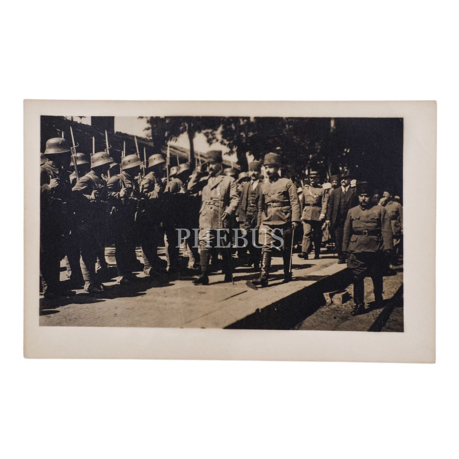 Mustafa Kemal Atatürk ve İsmet İnönü, Eskişehir´de, kendilerini tren istasyonunda karşılayan tören birliğini denetliyor, arkada Ankara Antlaşması görüşmeleri için Türkiye´ye gelen Henry Franklin-Bouillon görülmektedir, 6 Haziran 1921, 13x8 cm...