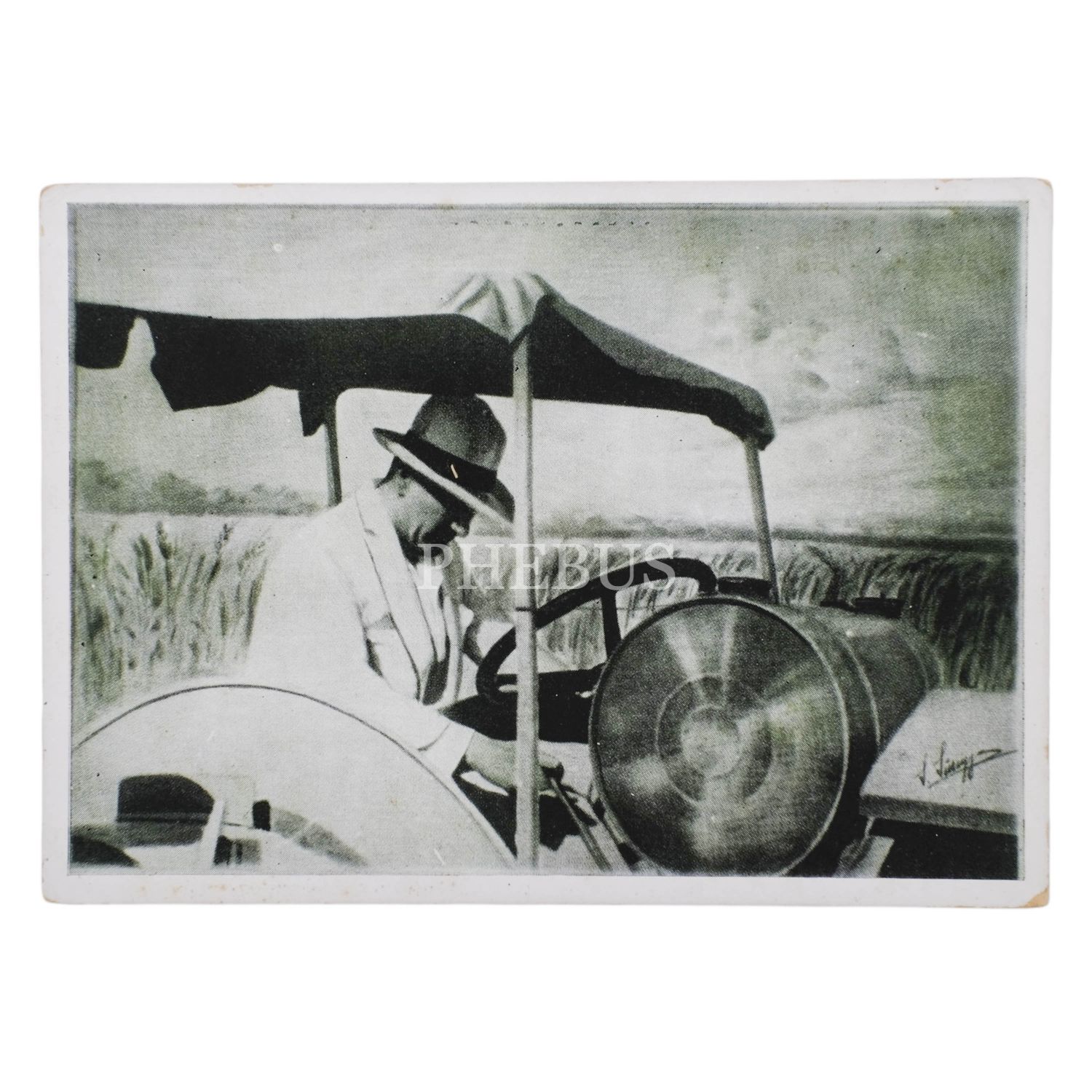 Mustafa Kemal Atatürk, modern tarım tekniklerinin örnek olarak gösterileceği bir uygulama alanı olarak kurdurduğu Gazi Orman Çiftliği´nde, yurtdışından getirttiği traktörlerden birini bizzat kullanıyor, 14 Temmuz 1929, 14x10 cm...