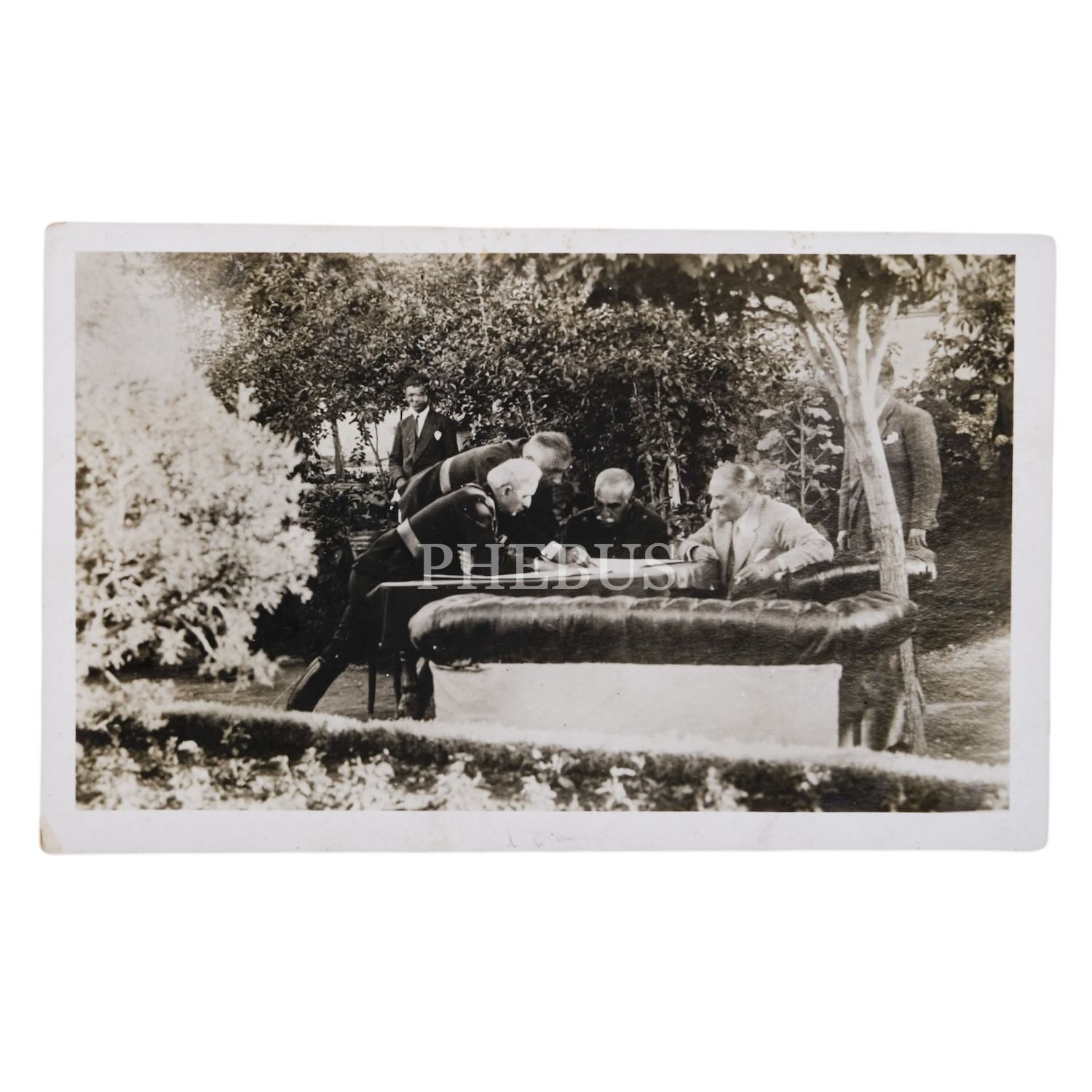 Mustafa Kemal Atatürk ve Türkiye´yi ziyaret eden İran Şahı Rıza Pehlevi, Afyon Orduevi Bahçesinde, İsmet İnönü ve Fahrettin Altay eşliğinde harita incelemesi yapıyor, 21 Haziran 1934, 14x9 cm...