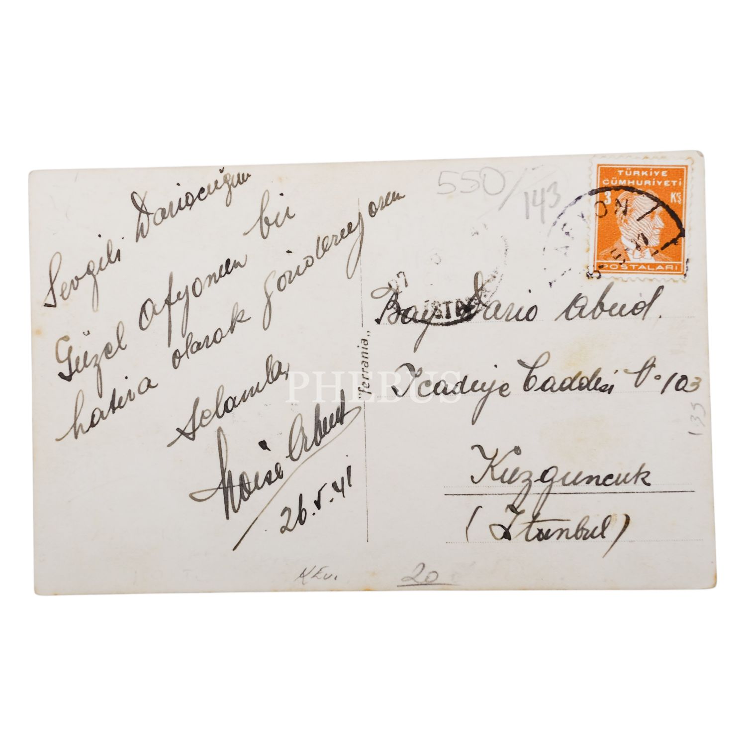 Arka yüzü mektuplu, pullu ve damgalı. Postadan geçmiş.