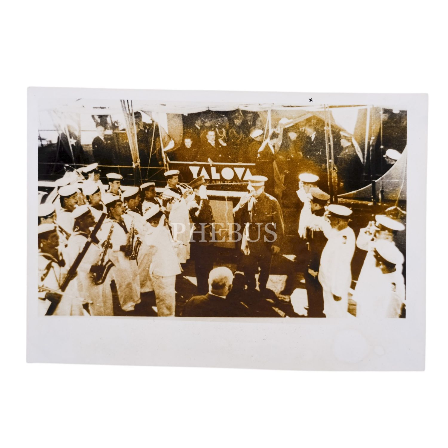 Mustafa Kemal Atatürk ve Türkiye´yi ziyaret eden İran Şahı Rıza Pehlevi´nin, Yalova gemisinden inerken askeri bando tarafından karşılanışı, Haziran 1936, 24x17 cm...