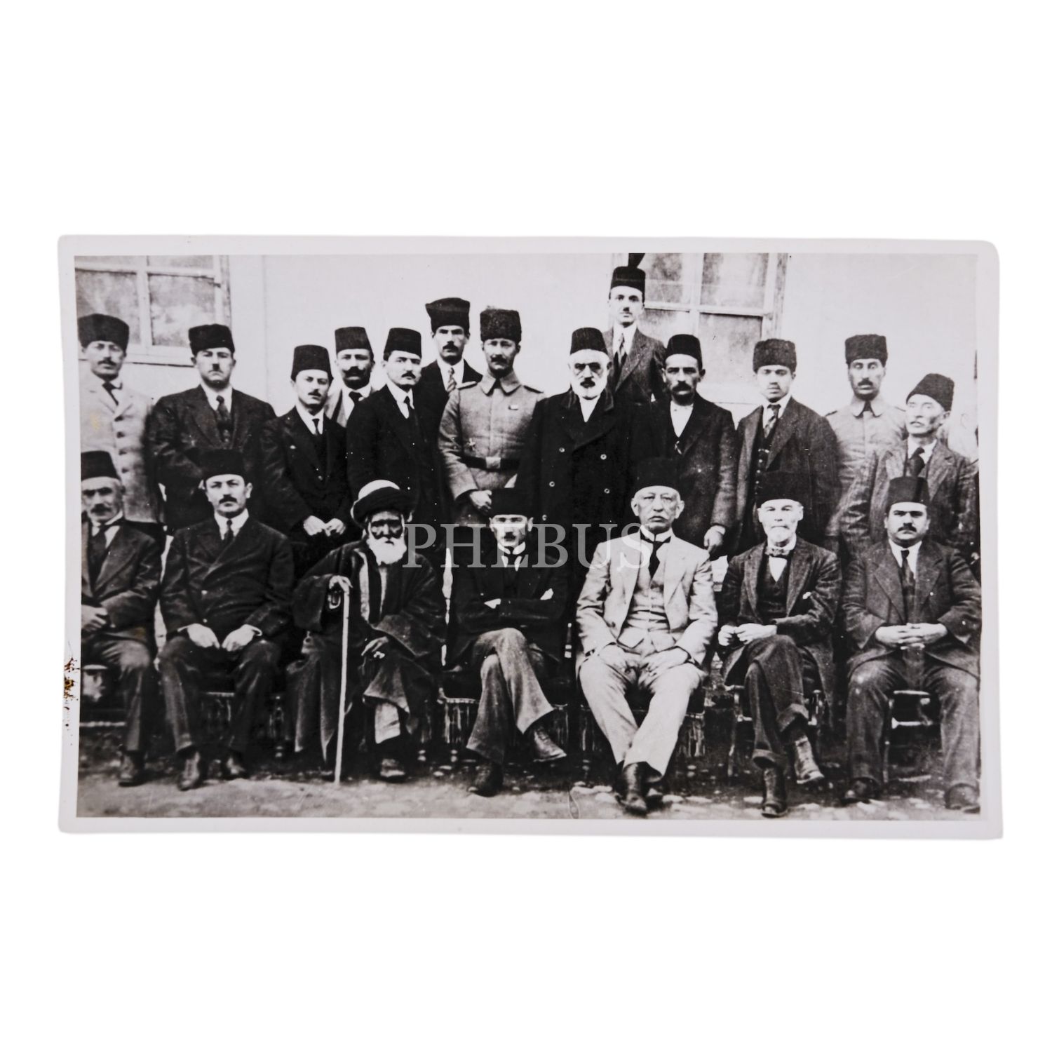 Mustafa Kemal Atatürk´ün, işgale uğrayan Türk topraklarını kurtarmak, Türk bağımsızlığını ve egemenliğini sağlamak maksadı güden vatan evlatlarına çağrıda bulunması üzerine Sivas´ta toplanan Heyet-i Temsiliye üyeleri ile birlikte çektirdiği Sivas Kongresi hatıra fotoğrafı, 17x11 cm...