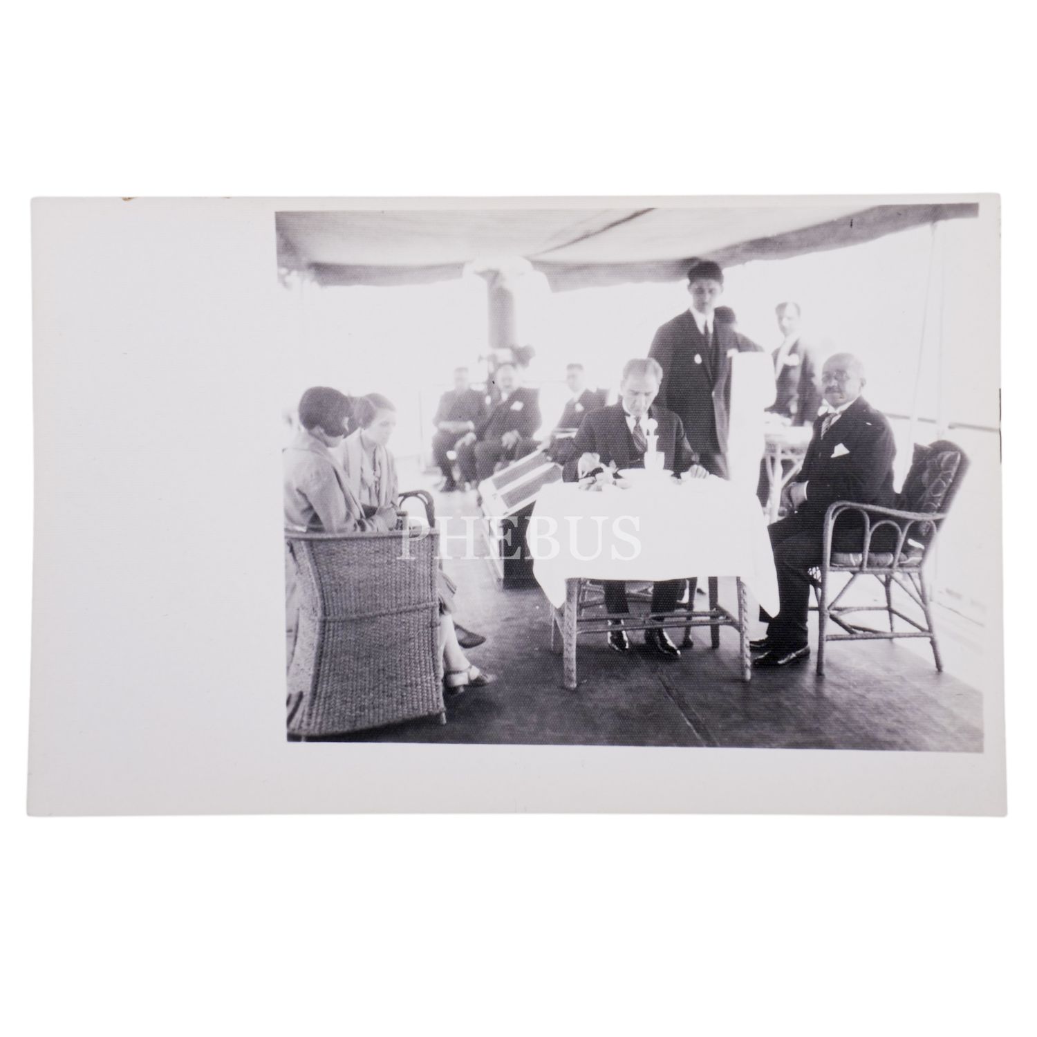 Cumhuriyet döneminde İstanbul’a ilk ziyaretini ancak 1927 yılında gerçekleştirebilen Mustafa Kemal Atatürk, İstanbul´a giriş yaptığı Ertuğrul Yatı´nın güvertesinde, doktoru İbrahim Tali Öngören ve manevi kızları Sabiha Gökçen ve Rukiye Erkin ile birlikte sofrada, 1 Temmuz 1927, 14x9 cm...