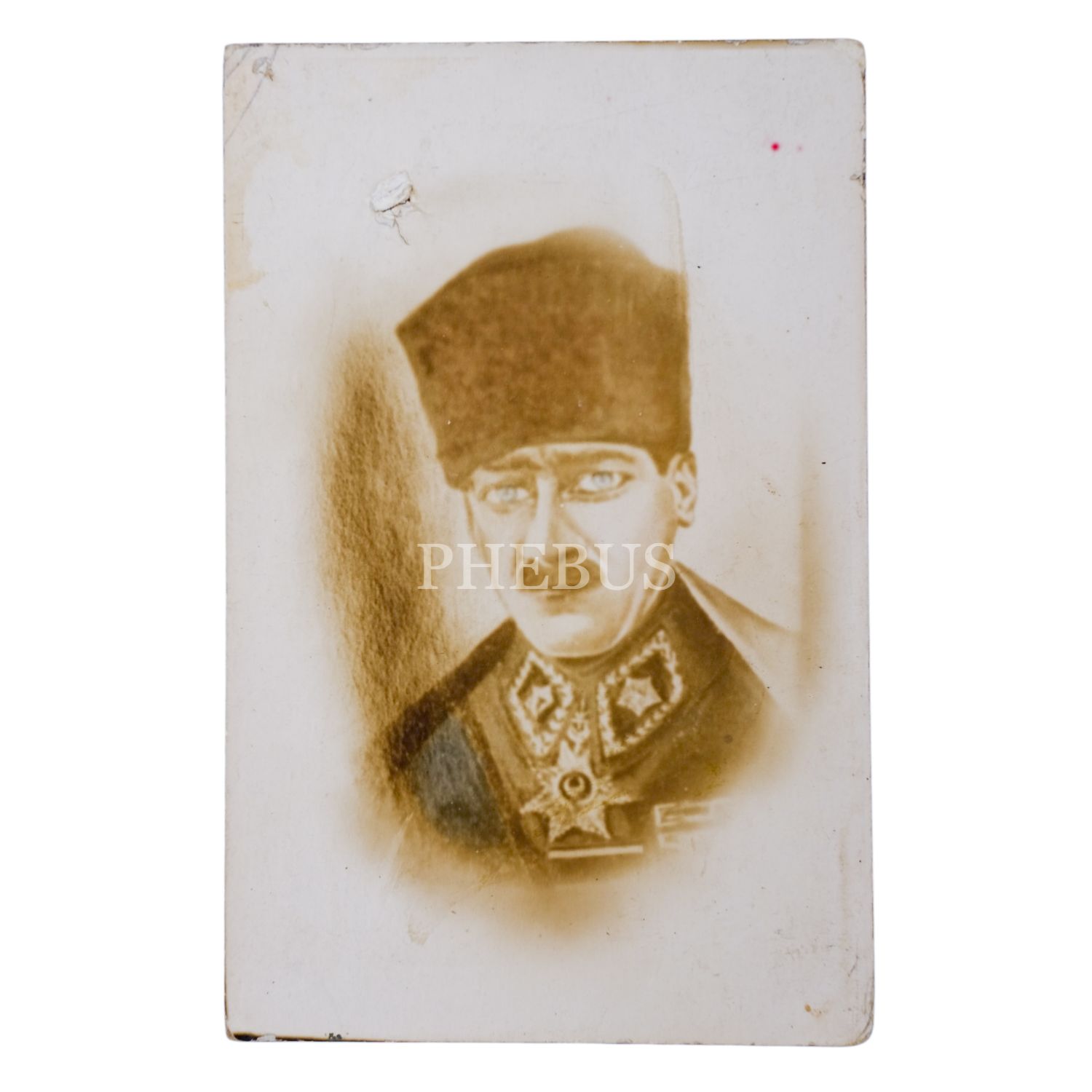 Mustafa Kemal Atatürk´ün Osmanlı nişanı ve kalpakla resmedildiği bir çizim portresi, 9x14 cm...