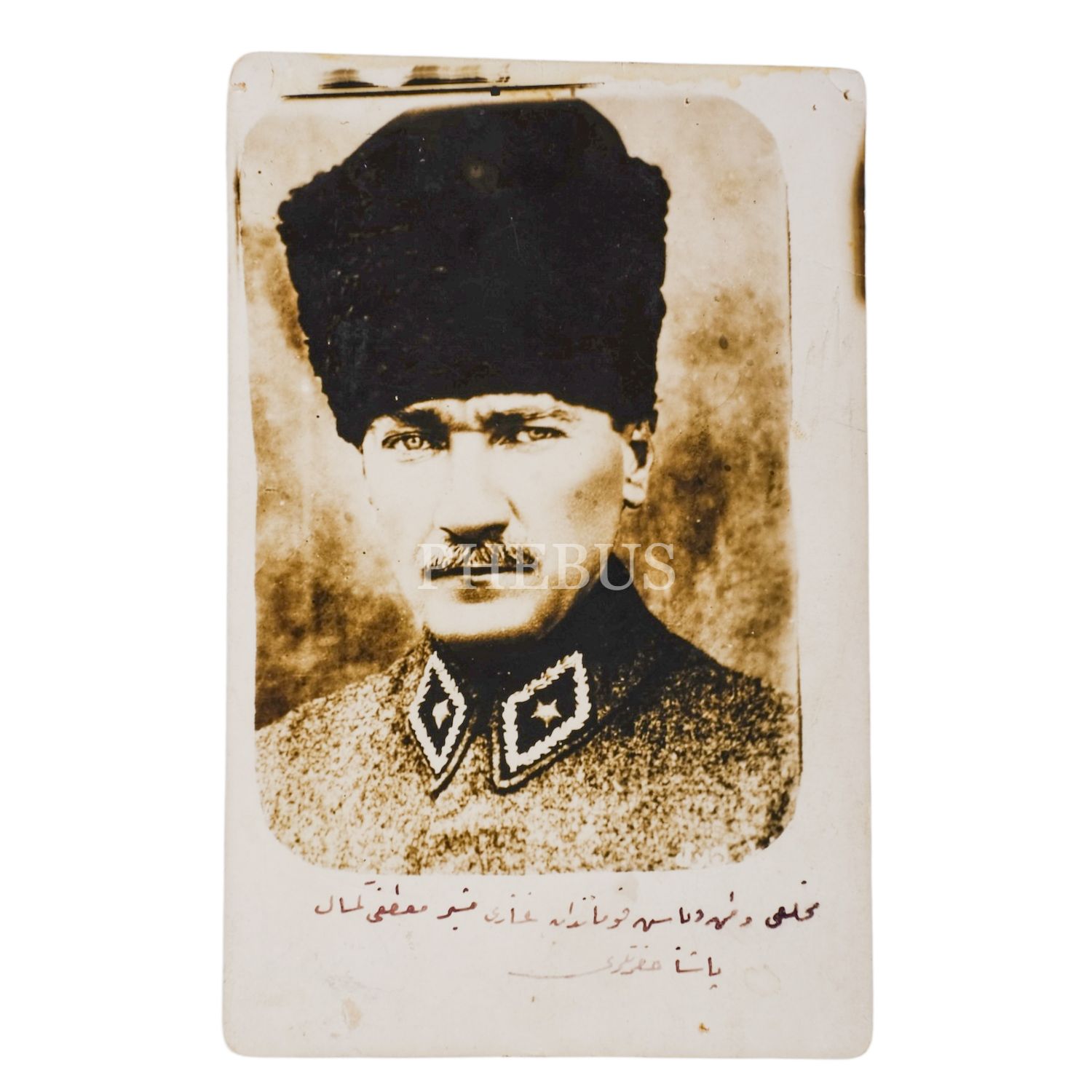 Mustafa Kemal Atatürk´ün askeri üniformasıyla görüldüğü, Osmanlıca başlıklı bir portre fotoğrafı, 9x14 cm...