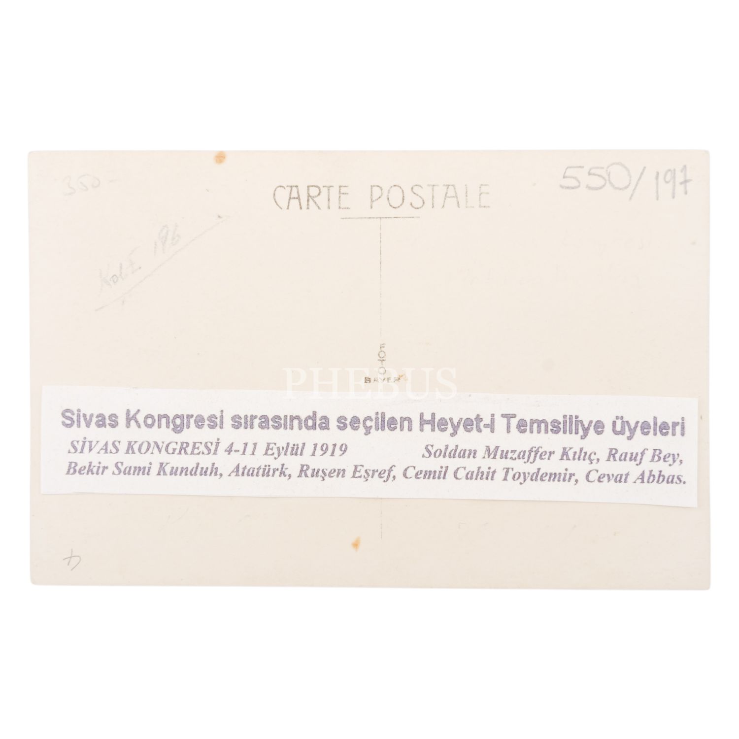 Mustafa Kemal Atatürk, Heyet-i Temsiliye üyeleriyle birlikte Sivas´ta, (soldan) Muzaffer Kılıç, Hüseyin Rauf Orbay, Bekir Sami Kunduh, Atatürk, Ruşen Eşref Ünaydın, Cemil Cahit Toydemir, Cevat Abbas Gürer, 14x9 cm...