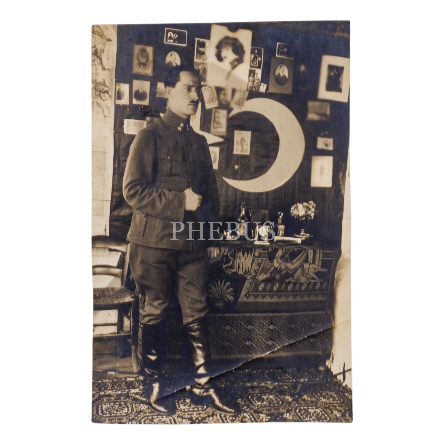 Duvarında Mustafa Kemal Atatürk ve İsmet İnönü kartpostalları bulunan bir odada poz veren Türk subayı, 9x14 cm...