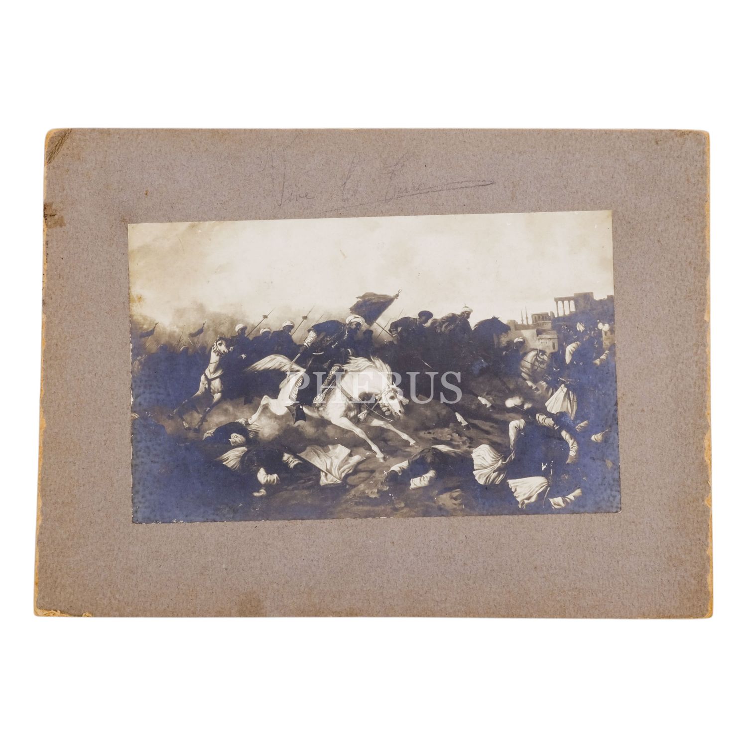 Bir Osmanlı savaşının betimlendiği tablonun, Harbiye Nezareti´ne ait bir damganın yer aldığı paspartuya yapıştırılmış fotoğrafı, fotoğraf 24x15 cm, paspartu 33x24 cm...