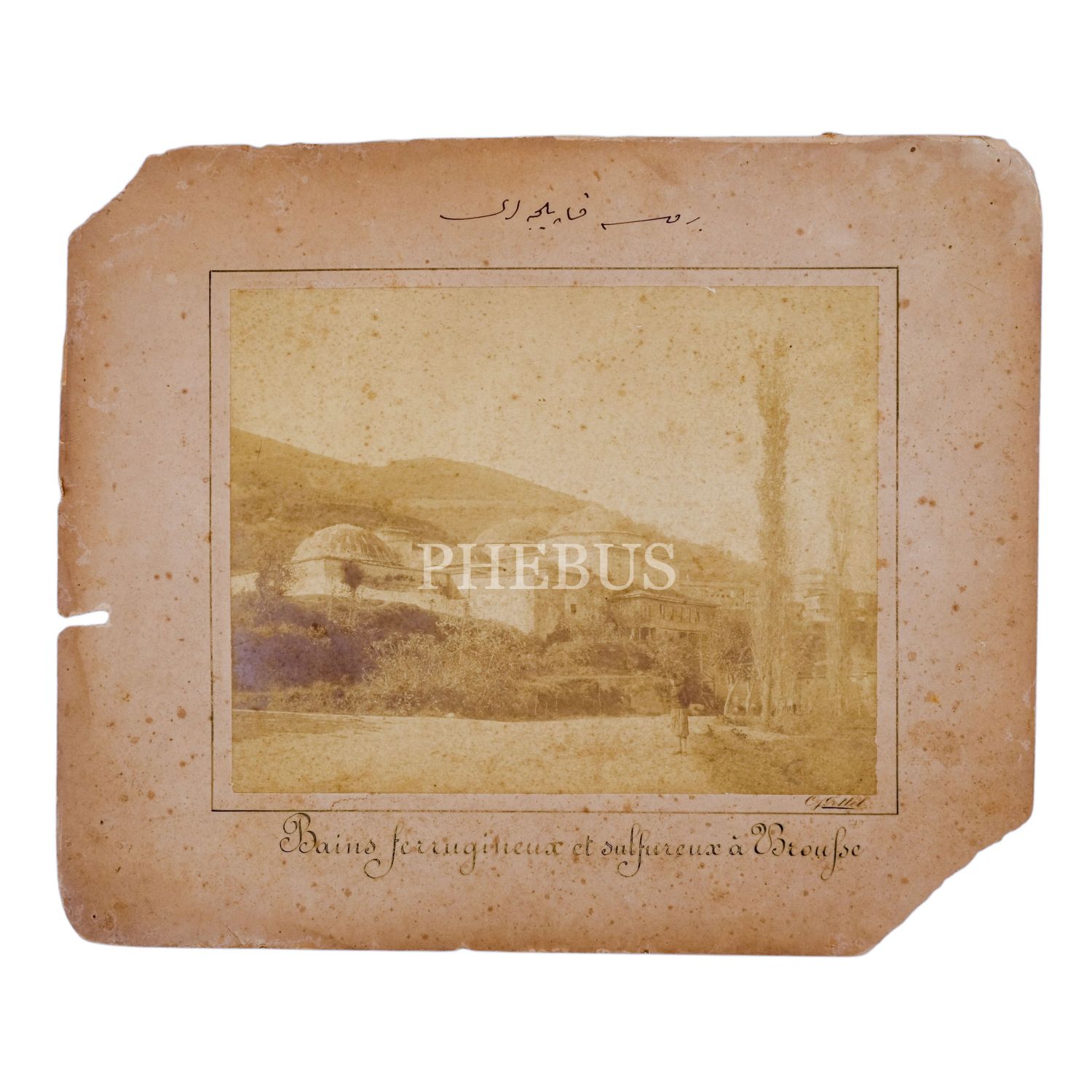 Osmanlı dönemi fotoğrafçışarından C. J. Fettel´in objektifinden ve ıslak imzasıyla, Bursa kaplıcalarının görüldüğü albümin fotoğraf, fotoğraf 26x21 cm...