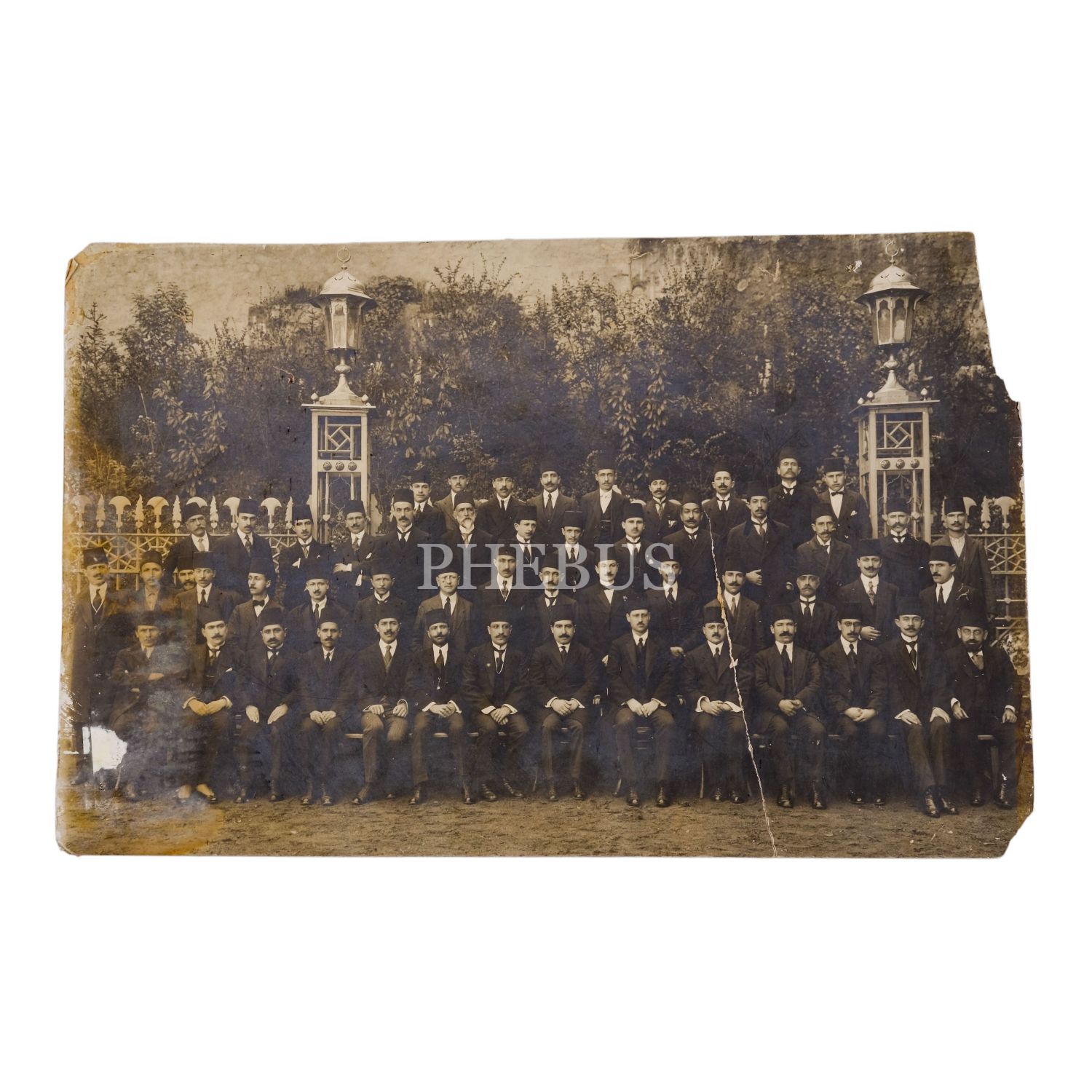 Şık giyimli Osmanlı beyefendilerinden oluşan bir heyetin hatıra fotoğrafı, 39x25 cm...