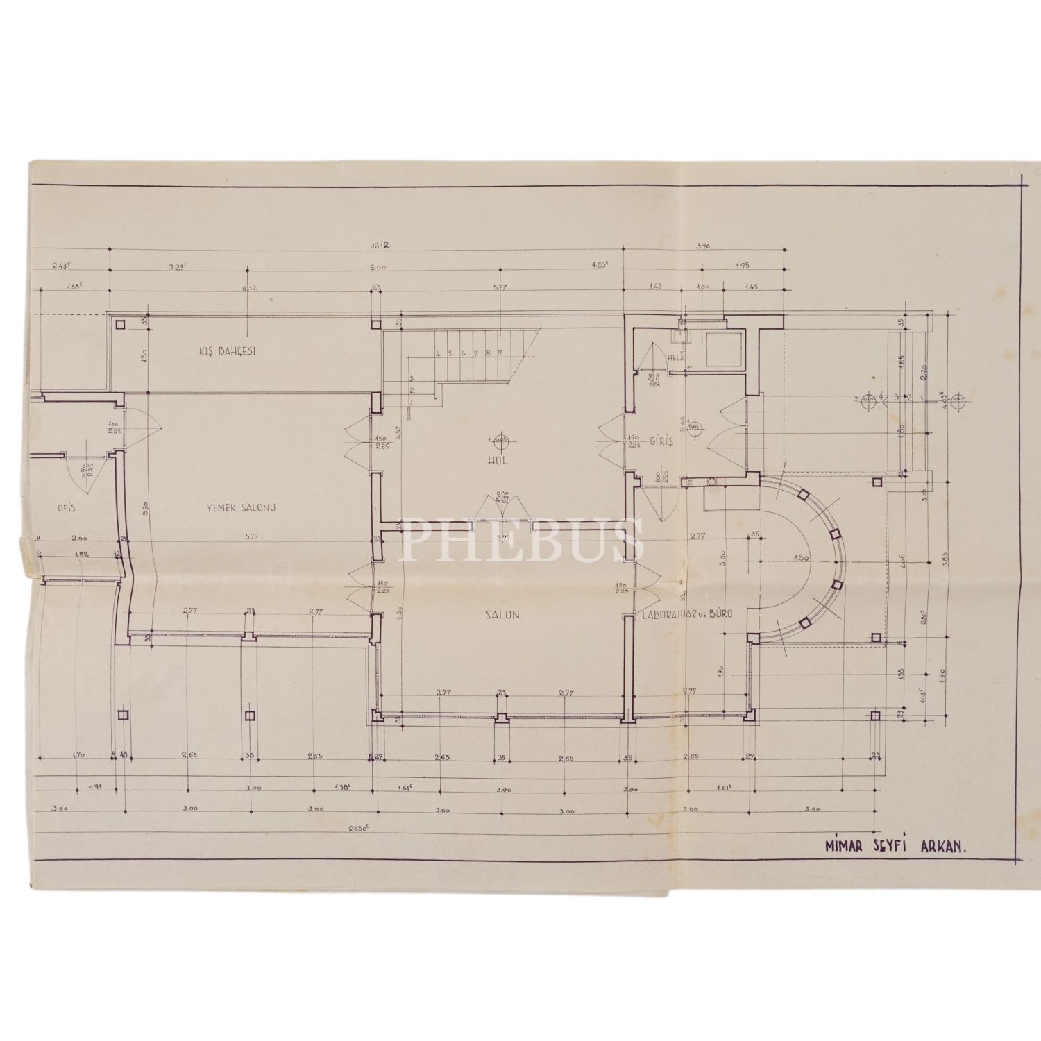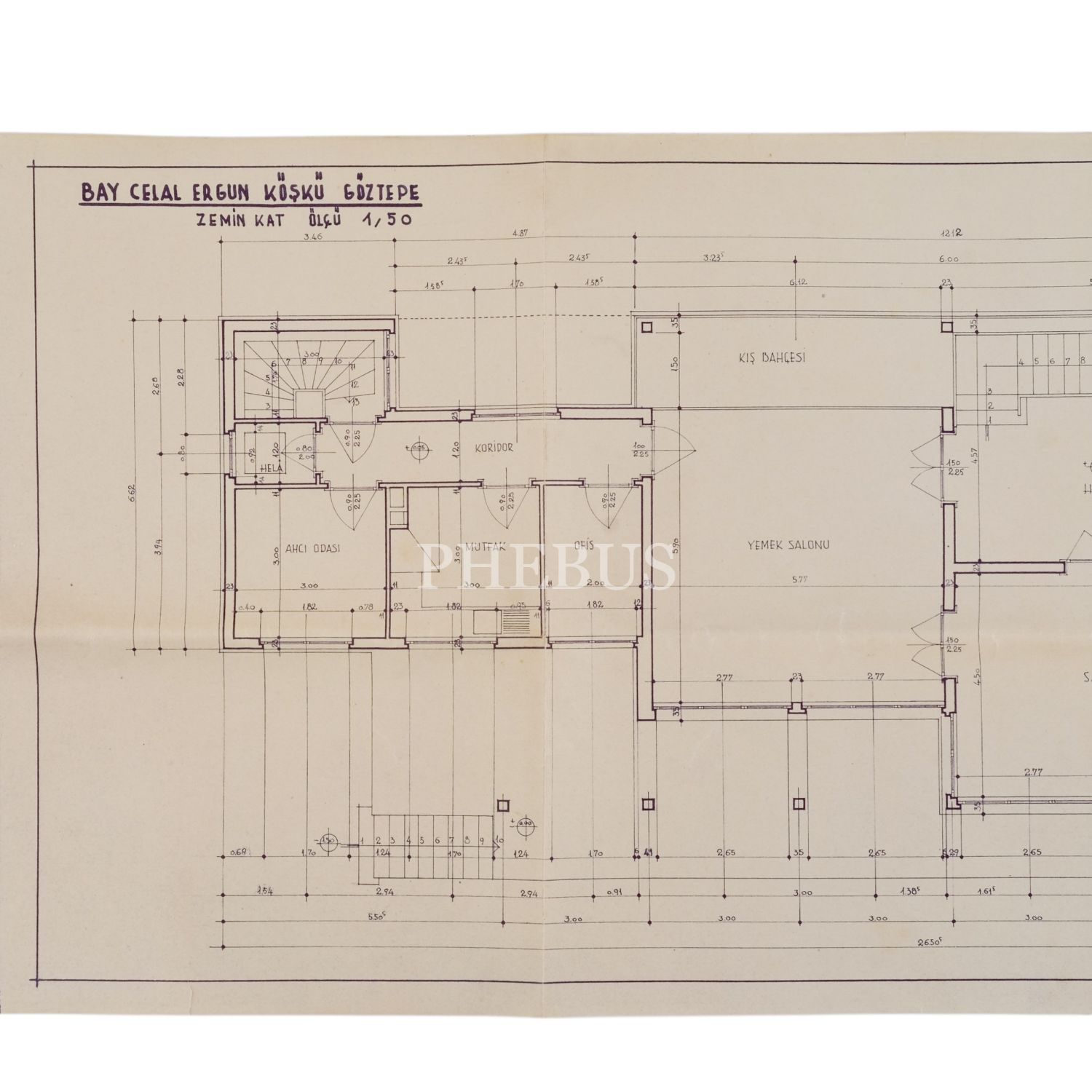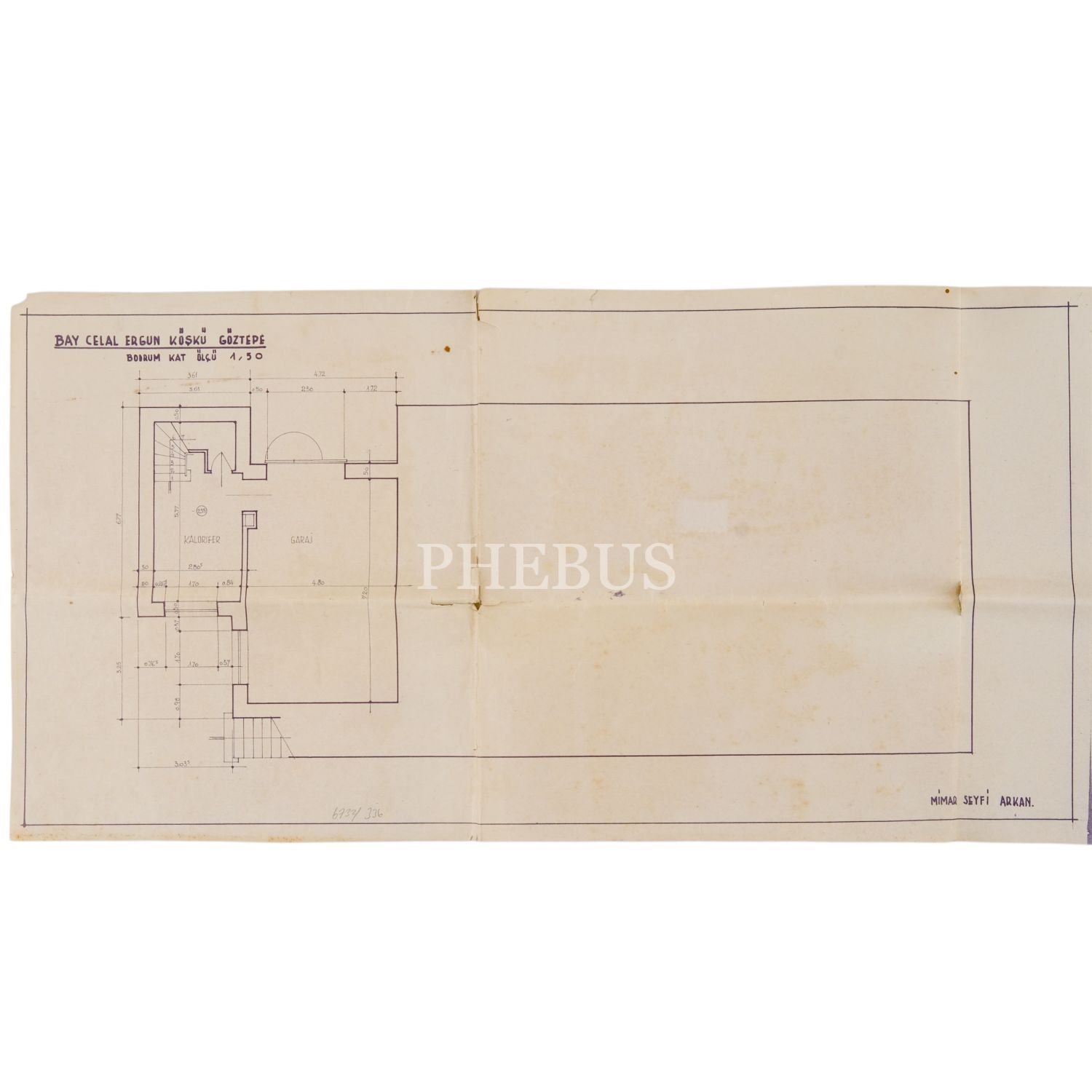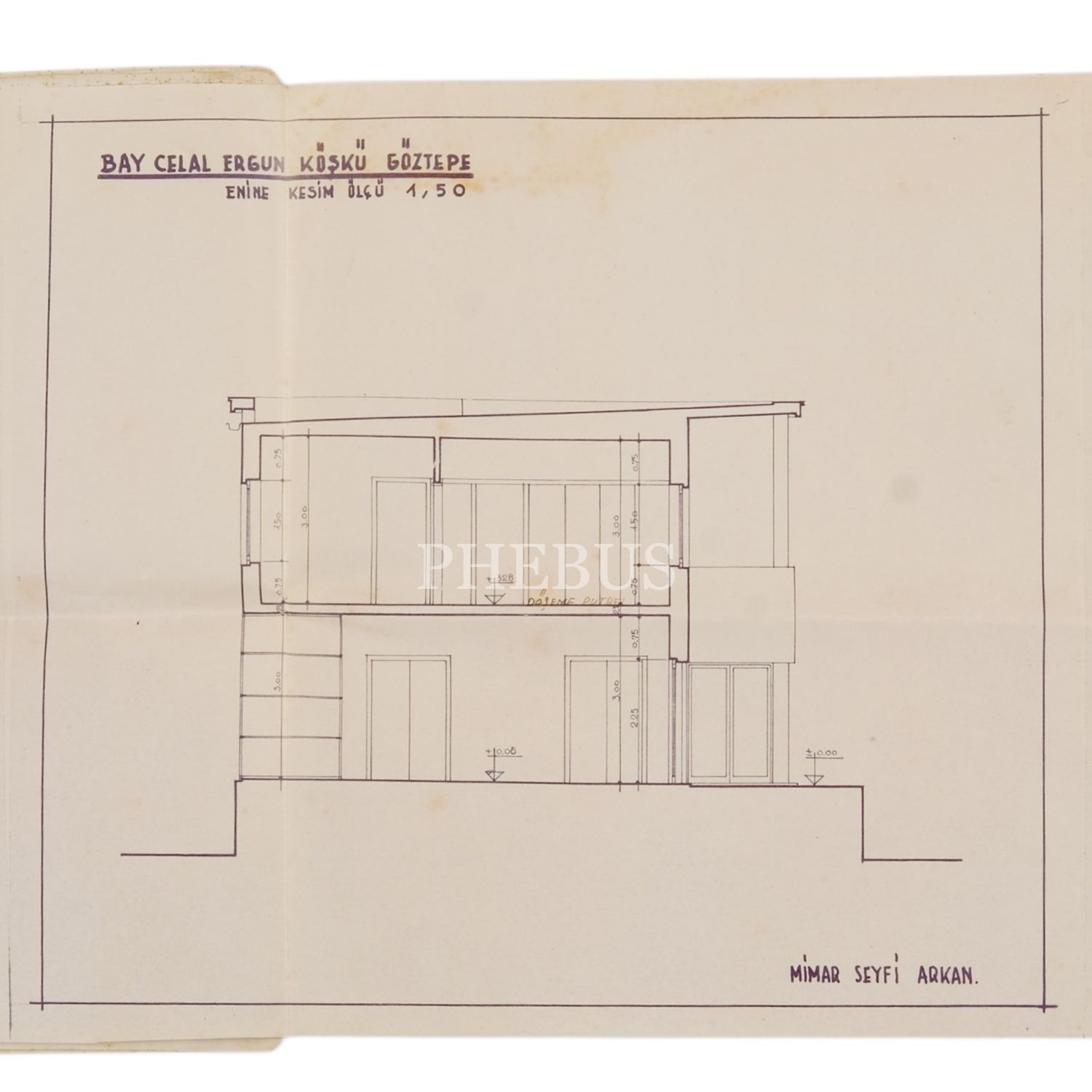 İhtifalci Mehmed Ziya Bey´in oğlu Bay Celal Ergun´un Göztepe´de inşa ettirdiği köşkün, Atatürk´ün mimarı olarak tanınan, Florya Deniz Köşkü´nün de mimarı Seyfi Arkan tarafından yapılmış mimari çizimleri, 480x35 cm...