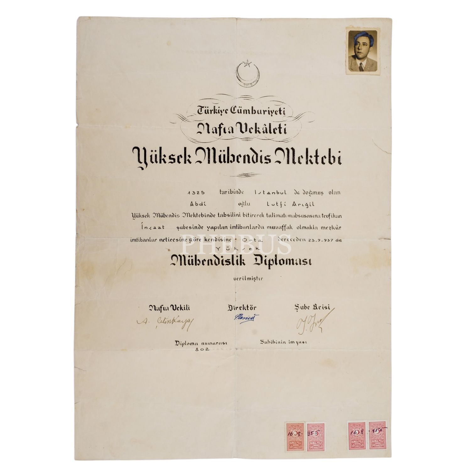 Türkiye Cumhuriyeti Nafia Vekaleti Yüksek Mühendis Mektebi tarafından Lütfi Arıgil´e veriken Yüksek Mühendislik Diploması, 50x35 cm...