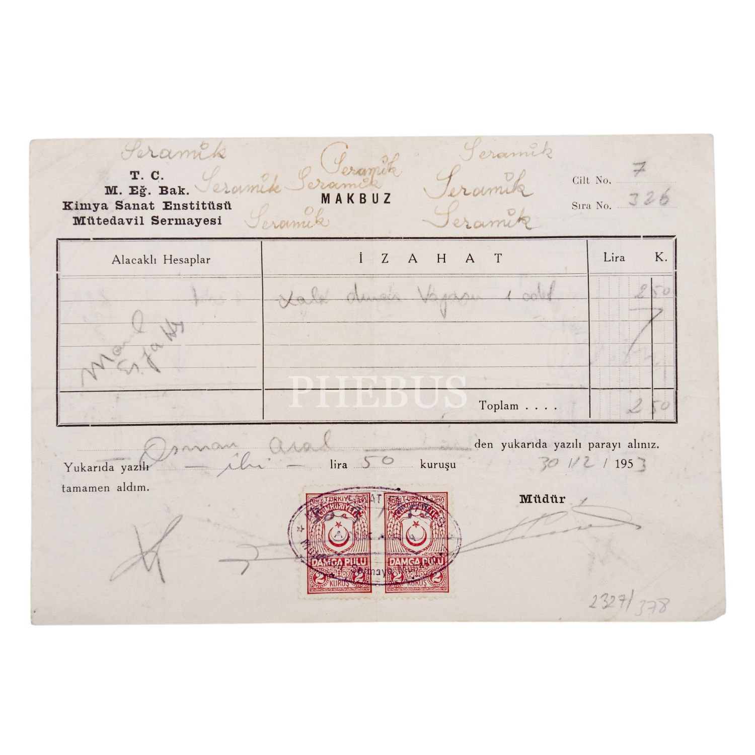 Arka yüzünde Ressam Cevat Dereli'nin "Hasanoğlan Köy Enstitüsü / 31-XII-953 - 959" notu düşerek orijinal bir desen çalışması resmettiği, "T.C. M. Eğ. Bak. Kimya Sanat Enstitüsü Mütedavil Sermayesi" antetli makbuz, 20x14 cm...ç