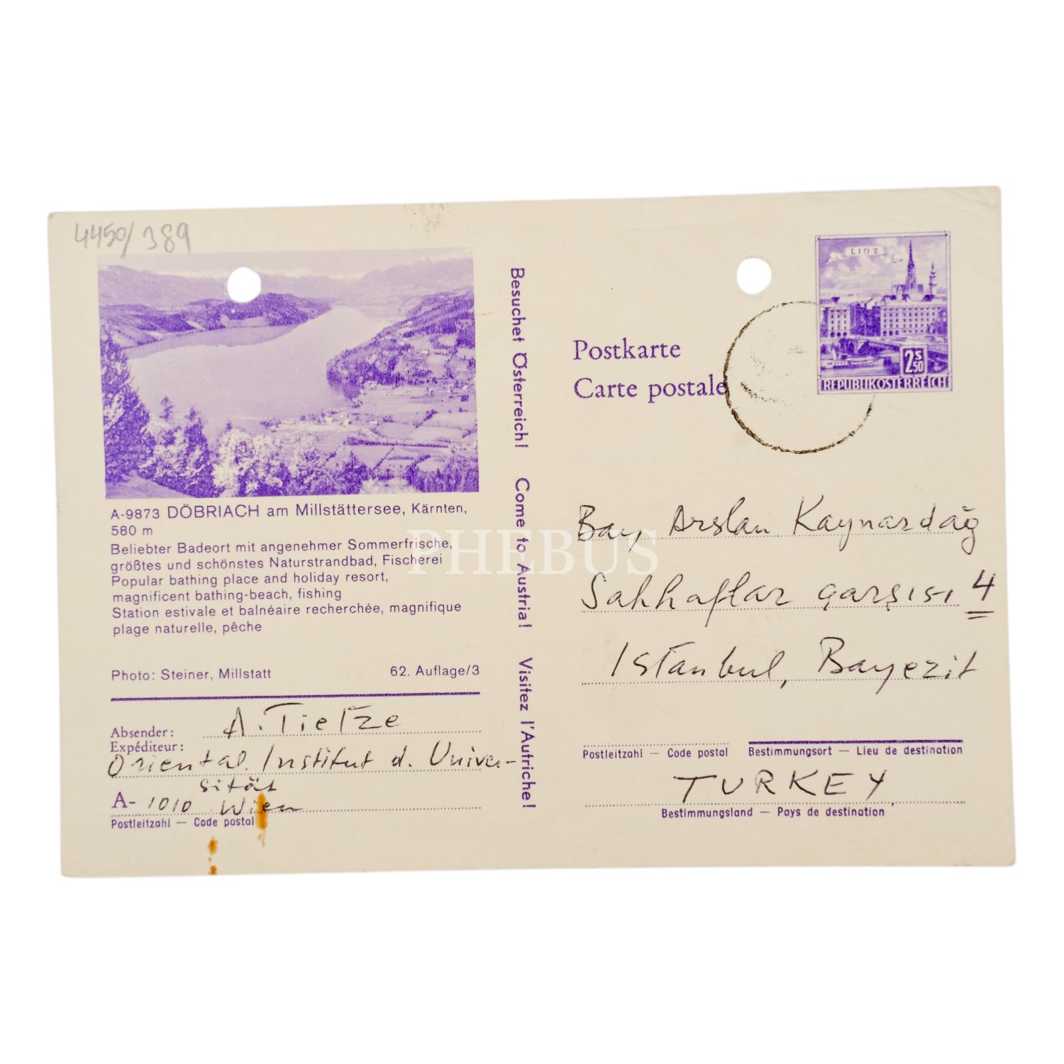Avusturyalı Türkolog Andreas Tietze tarafından Sahaflar Çarşısı içinde bulunan Elif Kitabevi´nin sahibi sahaf ve felsefeci Arslan Kaynardağ´a gönderilmiş mektuplu kartpostal, 26 Eylül 1973, 15x11 cm...