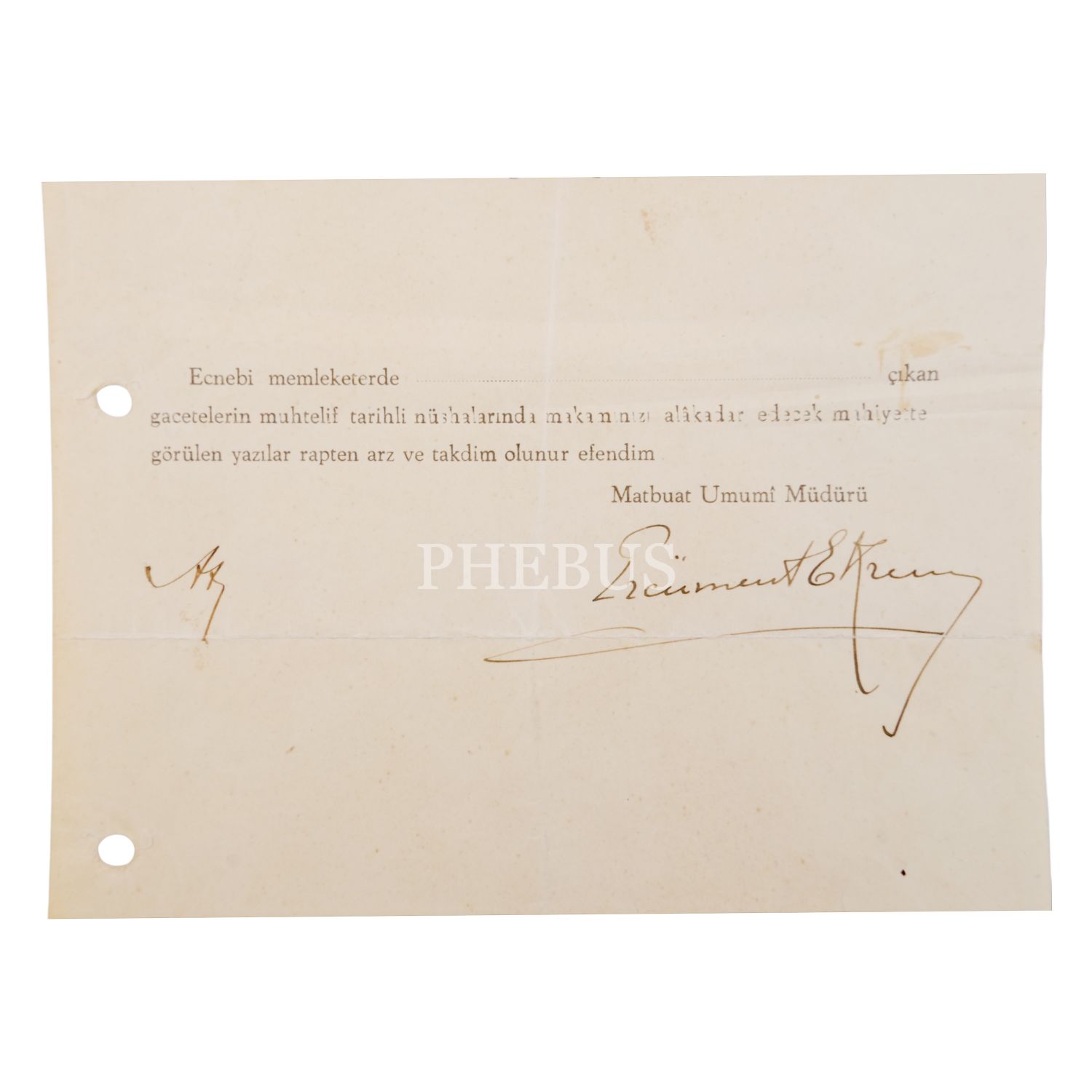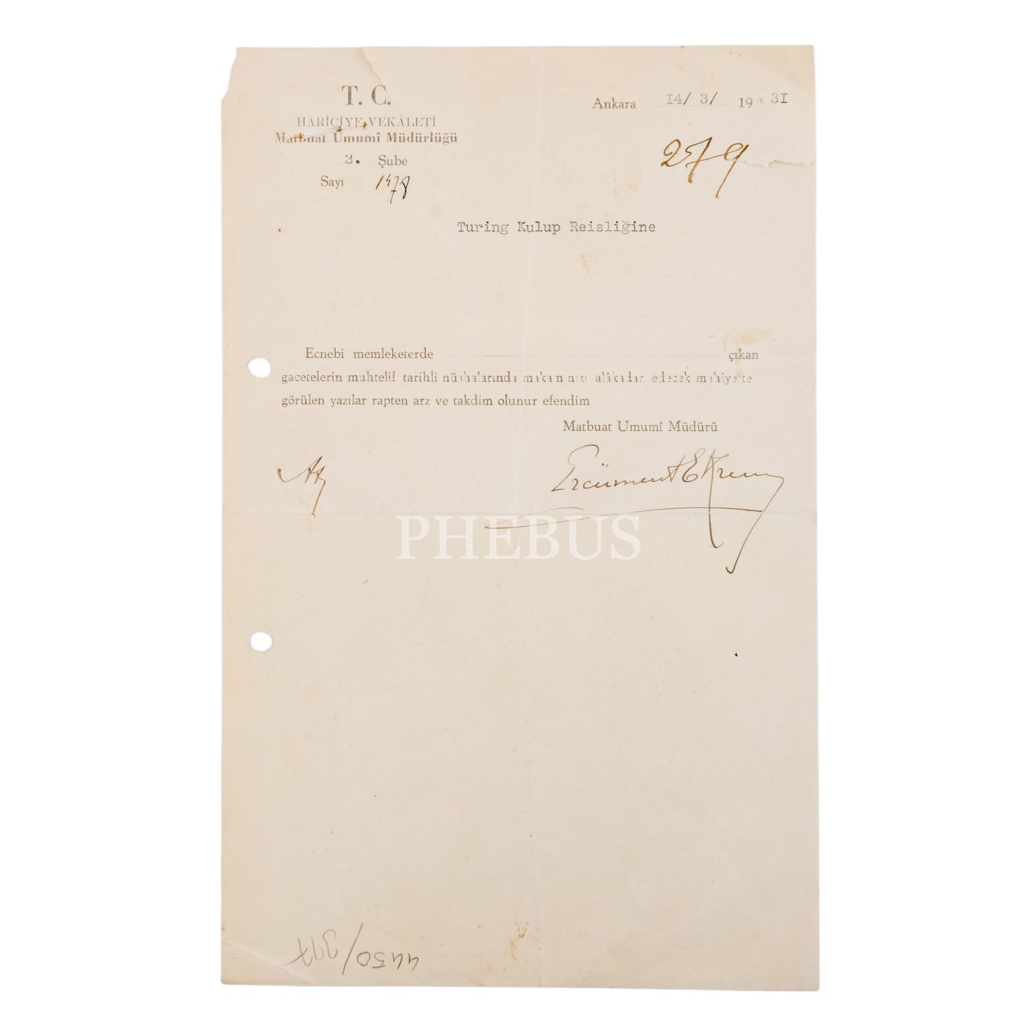 "Turing Kulüp Reisliğine, Ecnebi memleketlerde çıkan gazetelerin muhtelif tarihli nüshalarında makamınızı alâkadar edecek mahiyette görülen yazılar rapten (ek olarak) arz ve takdim olunur efendim. Matbuat Umumî Müdürü Ercüment Ekrem." Mektup kâğıdı Osmanlıca filigranlıdır.