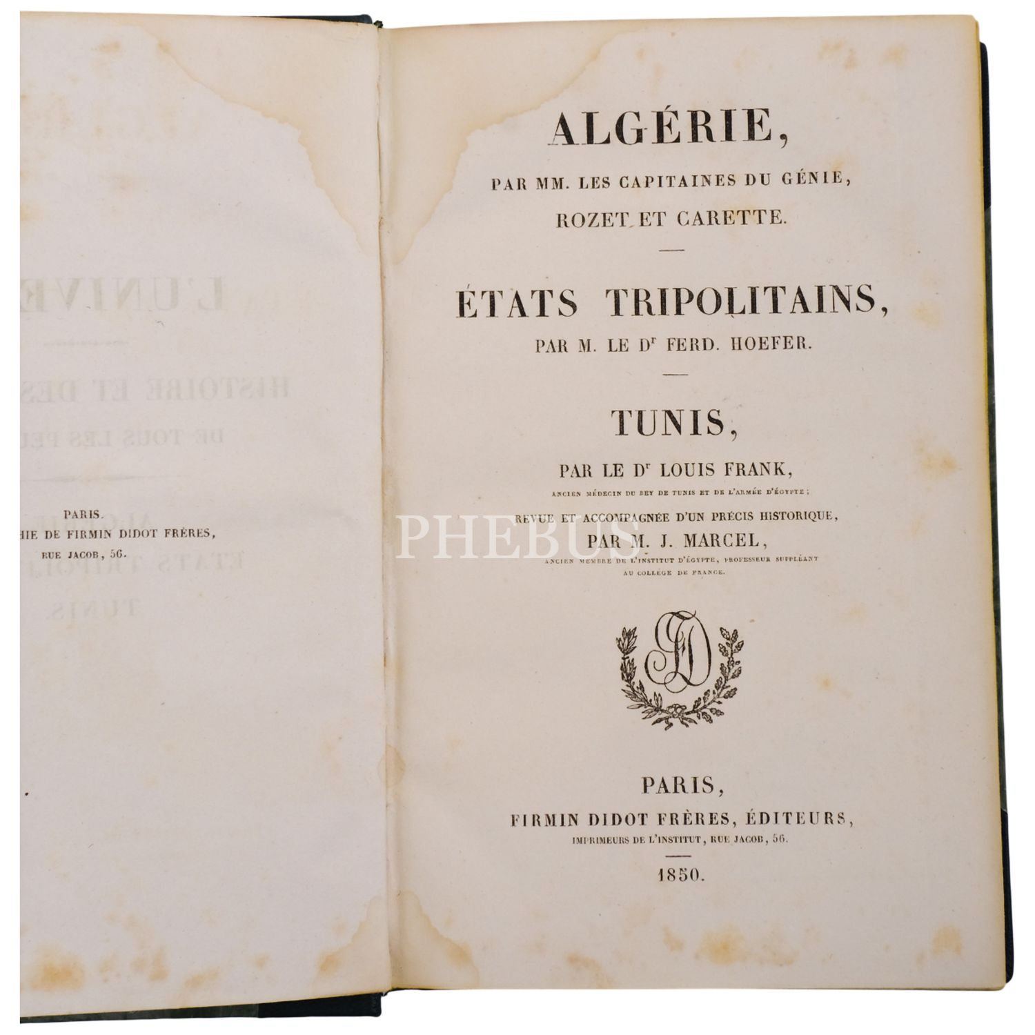 HISTOIRE ET DESCRIPTION DE TOUS LES PEUPLES - ALGERIE, ETATS TRIPOLITAINS, TUNIS, Ferd. Hoefer, Louis Frank, J. Marcel, 1850, Firmin Didot Freres, Editeurs, Paris, 337+128+228 sayfa, 14x21 cm...