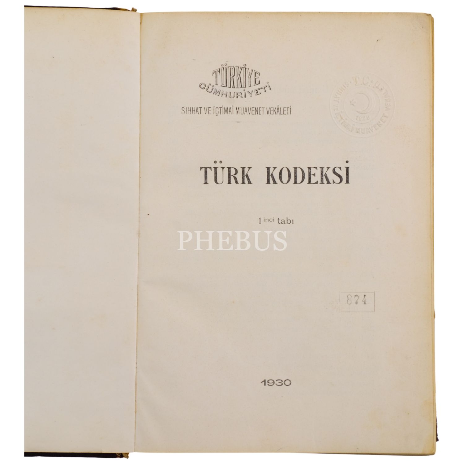 TÜRK KODEKSİ (1 inci tabı), 1930, Türkiye Cümhuriyeti Sıhhat ve İçtimaî Muavenet Vekâleti, Zelliç Biraderler Matbaası, 604 sayfa, 18x25 cm...