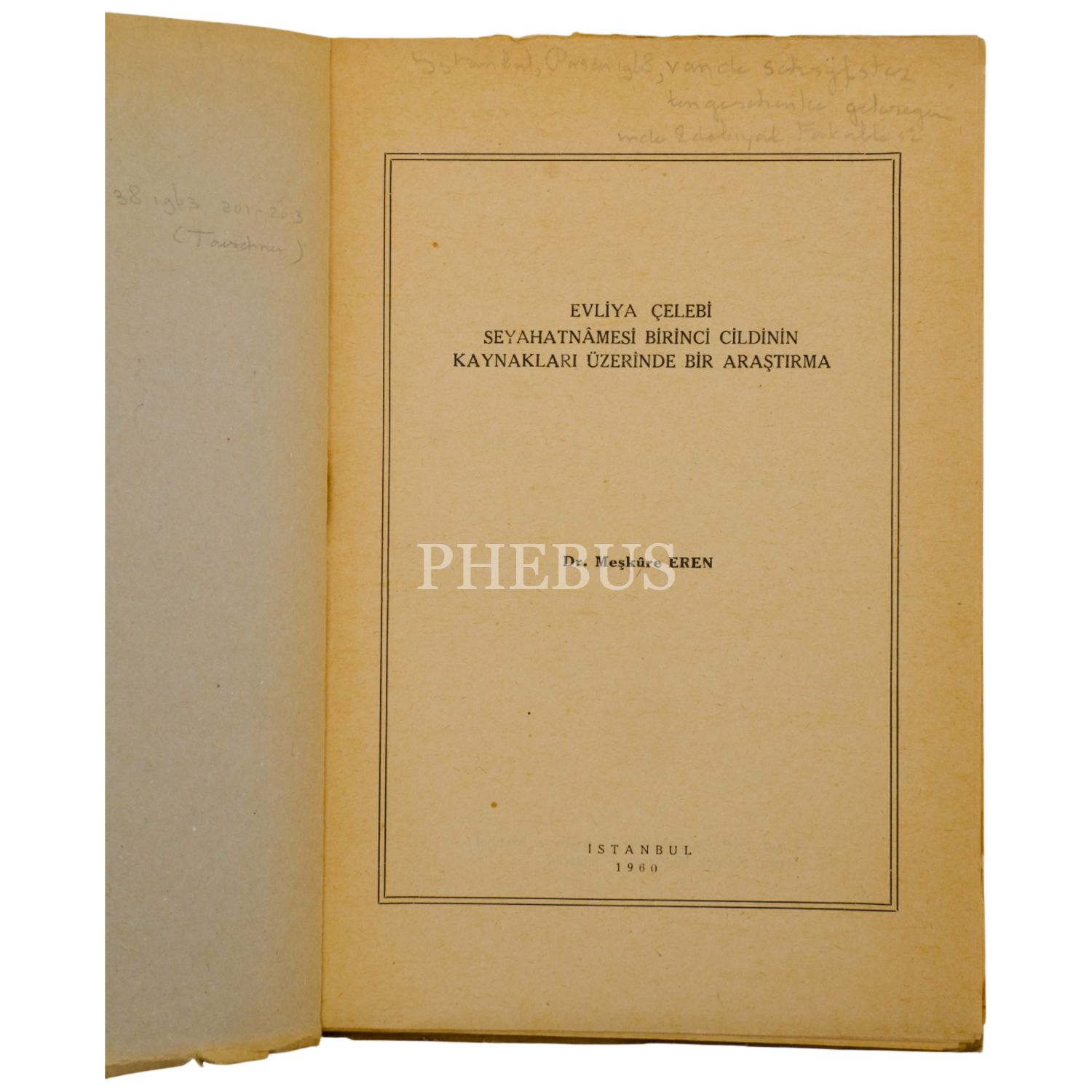 EVLİYA ÇELEBİ SEYAHATNÂMESİ BİRİNCİ CİLDİNİN KAYNAKLARI ÜZERİNDE BİR ARAŞTIRMA, Meşkûre Eren, 1960, 133 sayfa, 18x26 cm...
