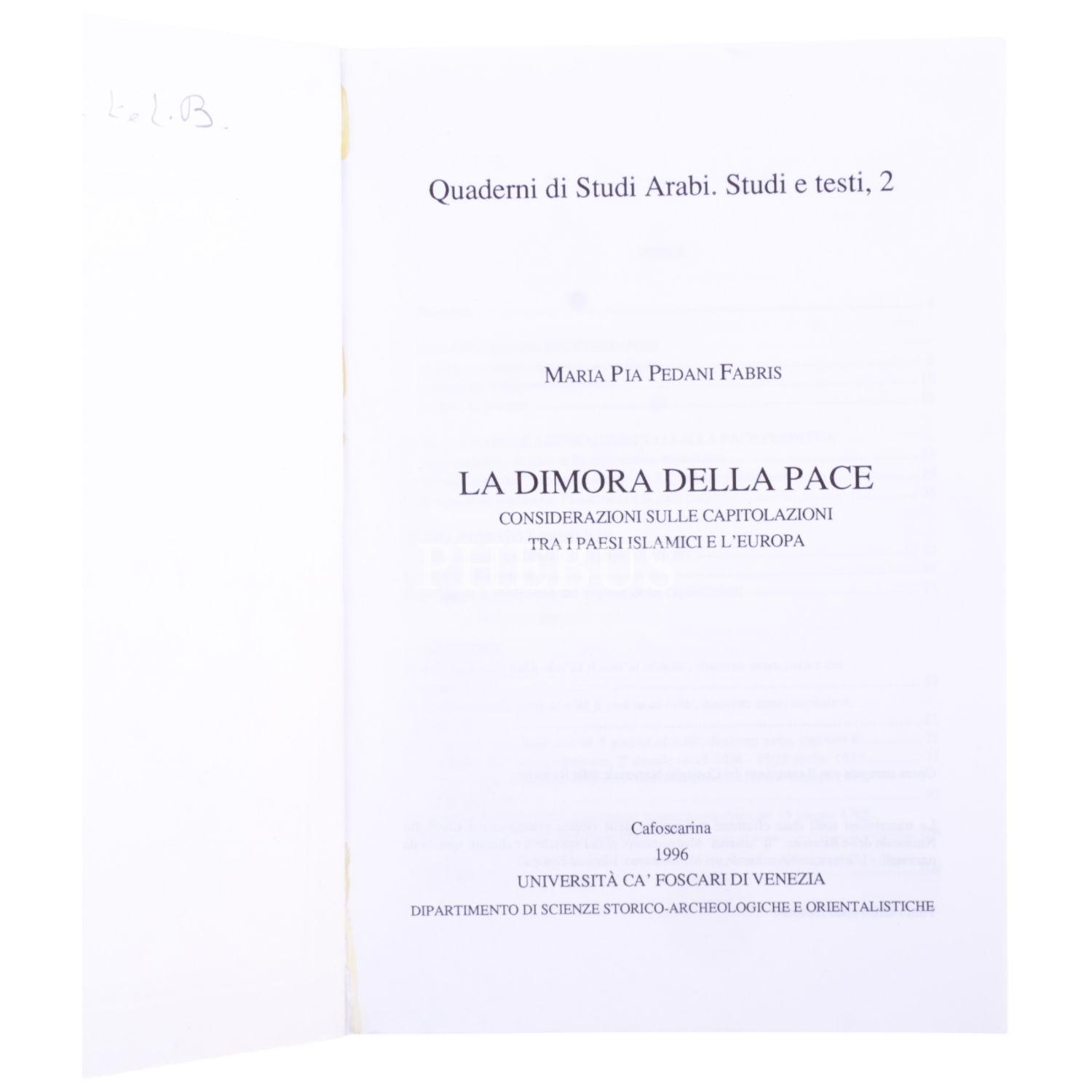 LA DIMORA DELLA PACE: CONSIDERAZIONI SULLE CAPITOLAZIONI TRA I PAESI ISLAMICI E L´EUROPA, Maria Pia Pedani Fabris, Universita Ca´ Foscari di Venezia, 111 sayfa, 17x24 cm...