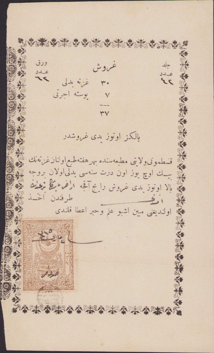 Kastamonu Vilayeti Matbaası'nda basılmış bir gazete için kesilen makbuz, 1897 tarihli, pullu