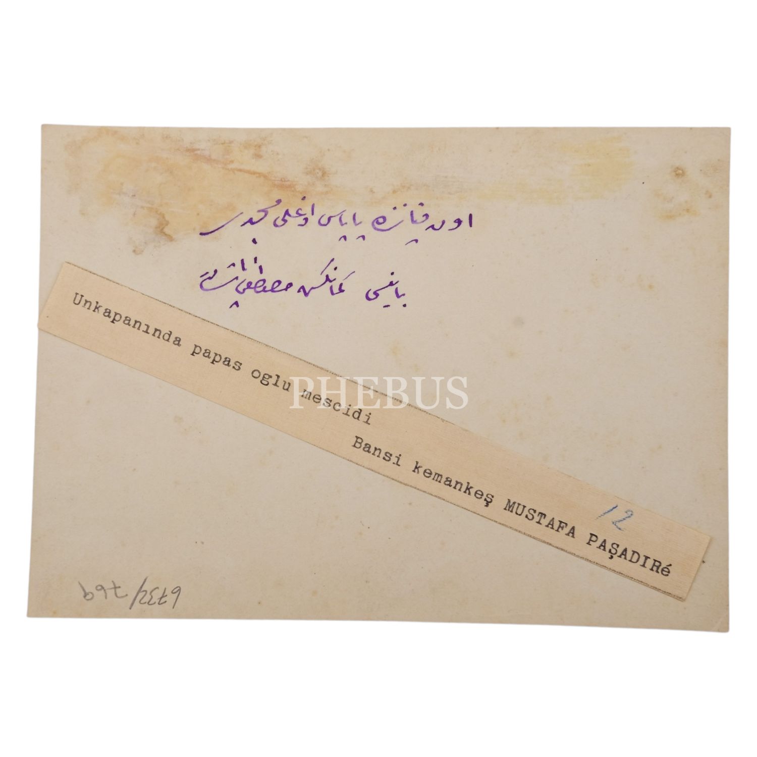 Arka yüzü el yazısı Osmanlıca açıklamalı ve matbu yeni harfli açıklama bantlı.