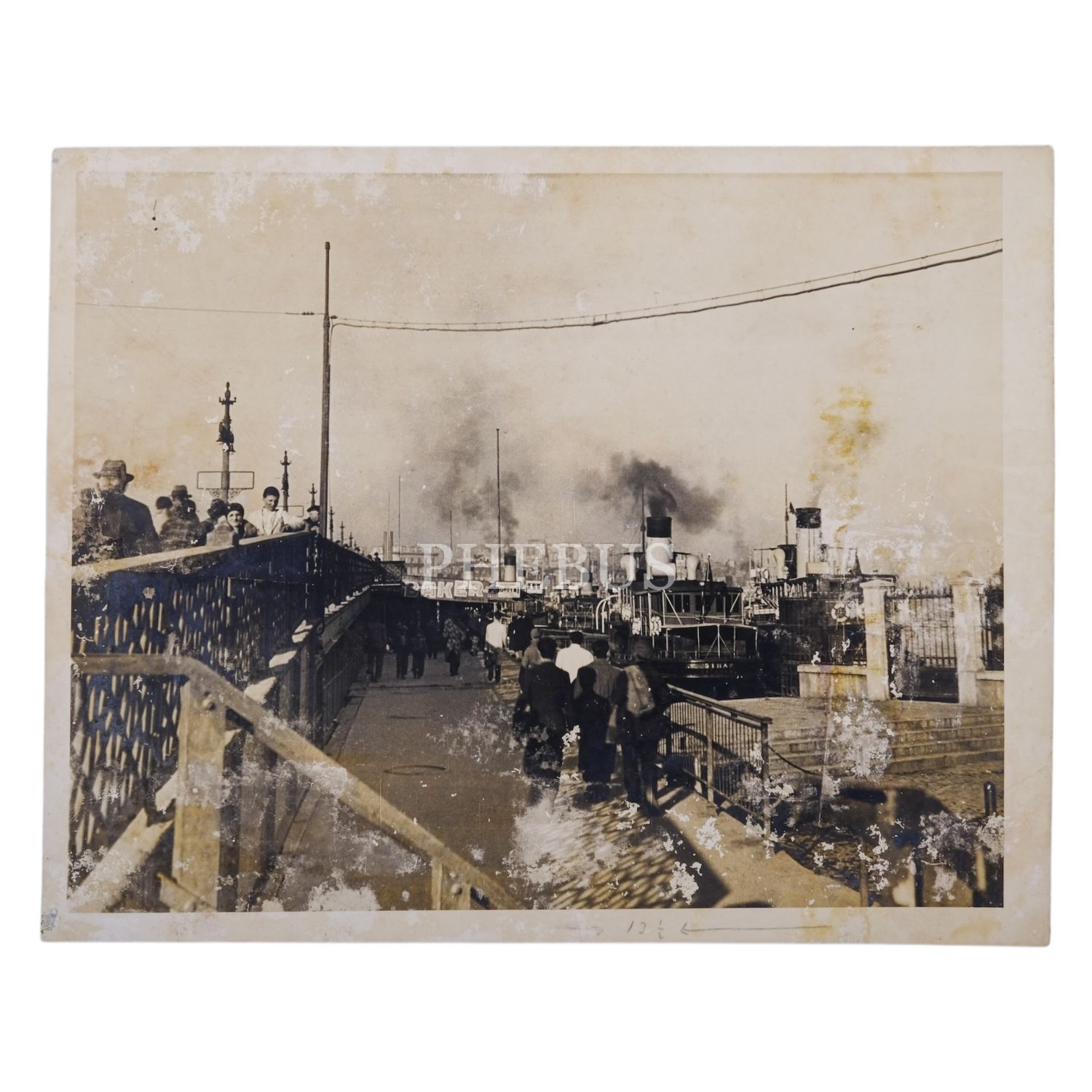 (Eski) Galata Köprüsü İskelesi´nden enstantane bir görünüm, fotoğrafta meşhur Baker Mağazaları reklamı ve 1905-1965 yılları arasında hizmet veren Şihap Vapuru görülmekte, 31x25 cm...