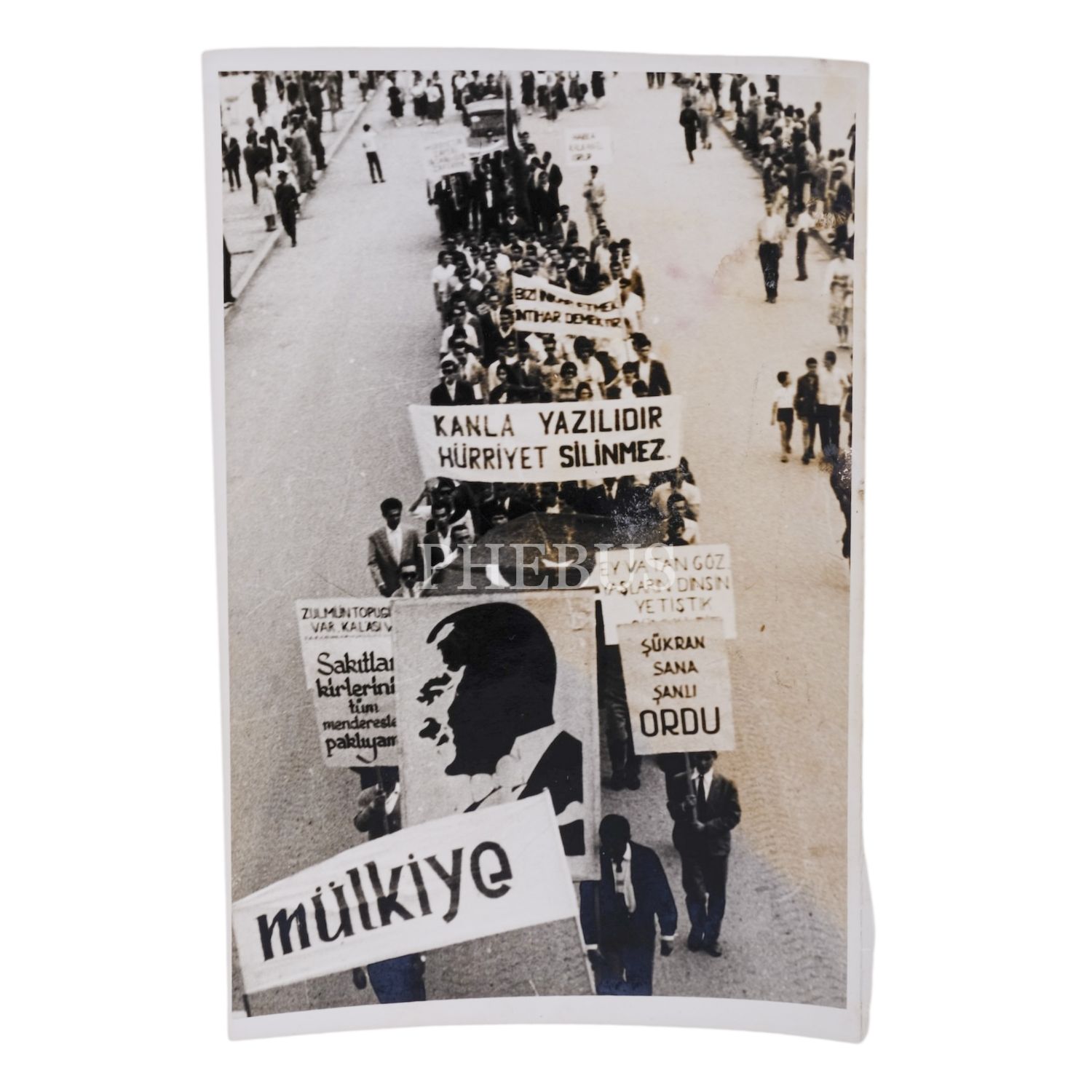 27 Mayıs İhtilali sonrası ellerinde pankartlarla yürüyüş yapan Mülkiye Mektebi öğrencileri, "Kanla yazılıdır hürriyet silinmez", "Şükran sana şanlı ordu", "Ey vatan gözyaşların dinsin, yetiştik çünkü biz", 12x18 cm...