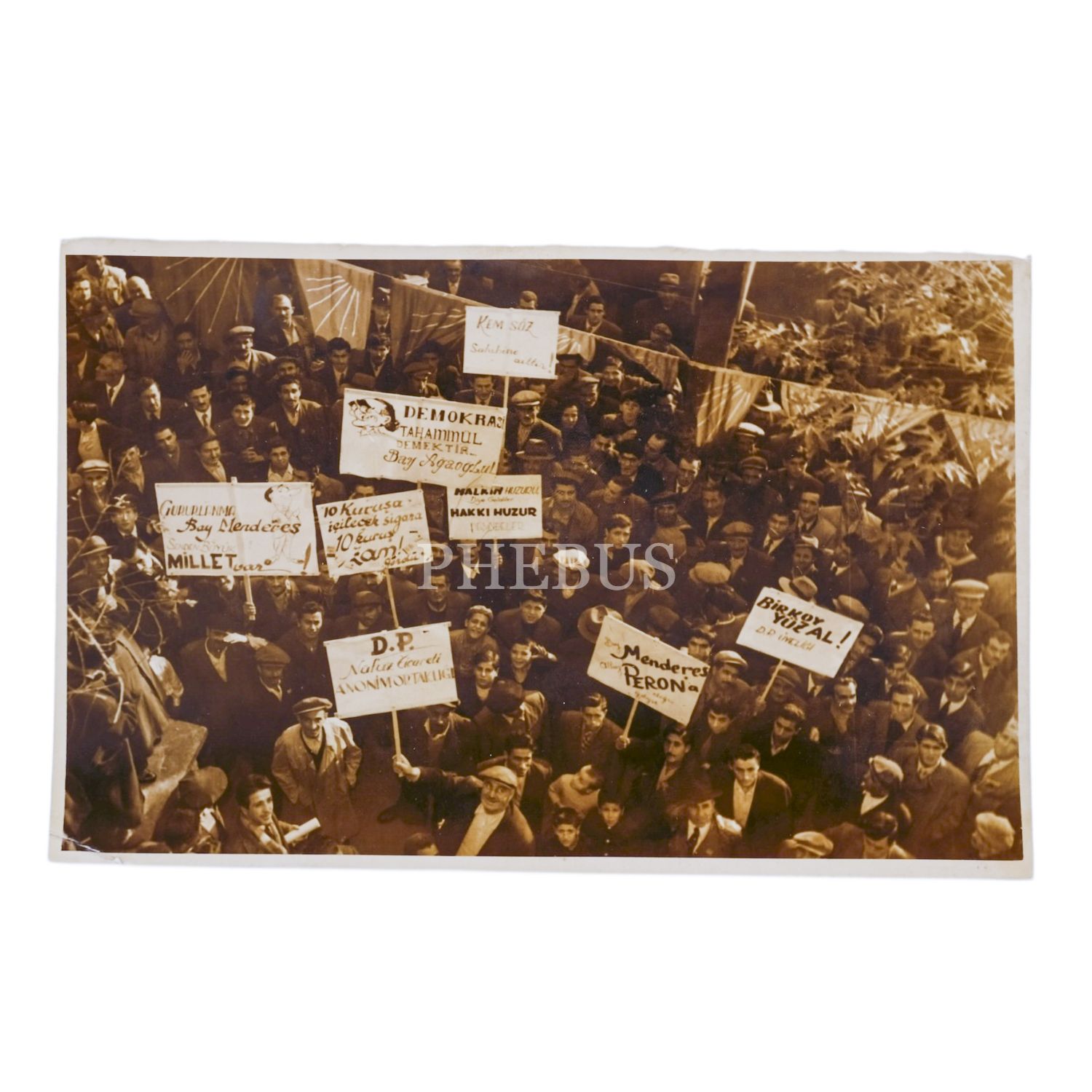 CHP Malatya Ocağı açılışı için ellerinde Demokrat Parti ve Adnan Menderes karşıtı slogonlar yazılı pankartlarla toplanmış partililer, 18x12 cm...