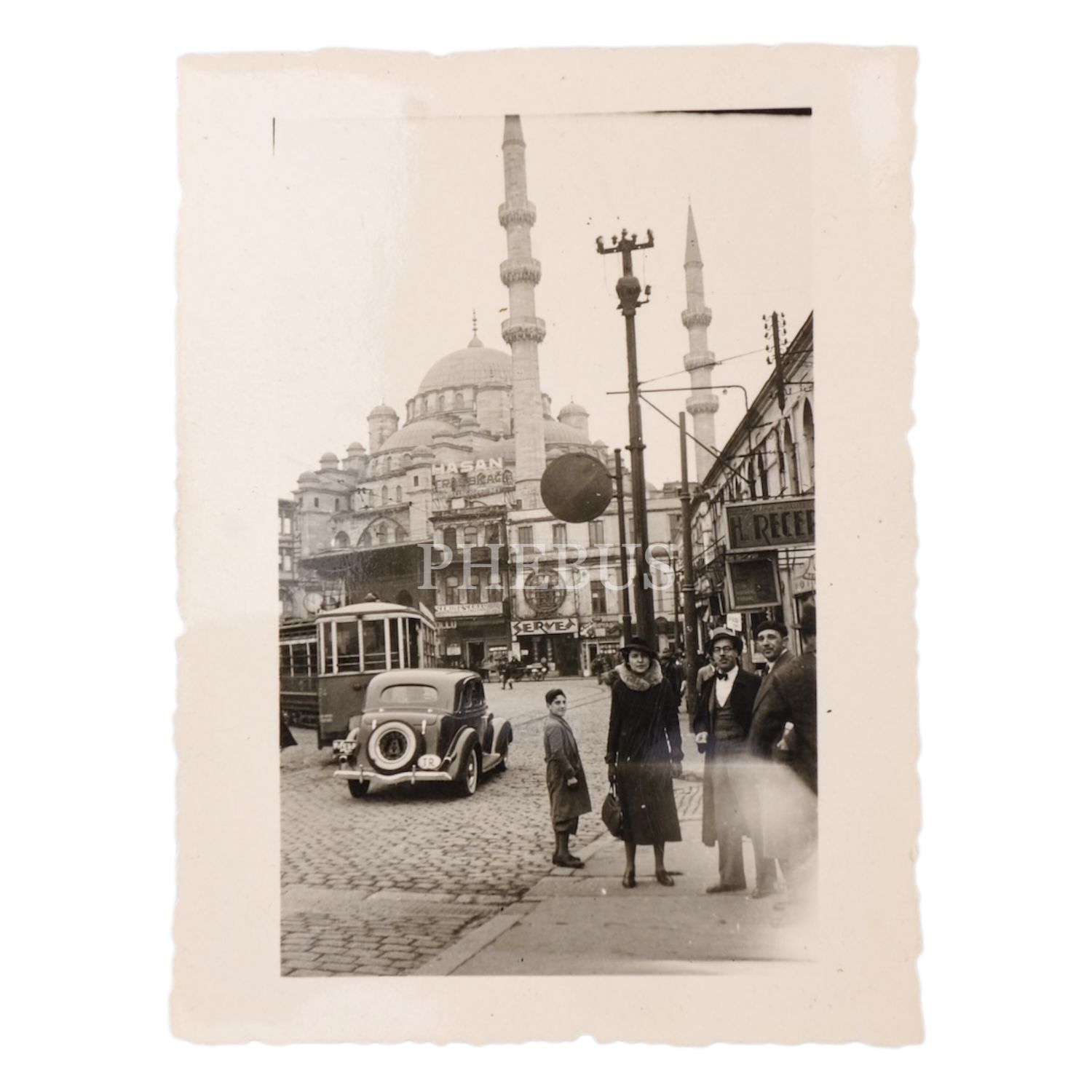 İstanbul, Eminönü: Cumhuriyet´in ilk yıllarında, Yeni Cami yakınlarında alınmış; otomobil, tramvay, esnaf/reklam tabelaları ve modern giysili vatandaşların görüldüğü bir hatıra fotoğrafı, 6,5x8,5 cm...