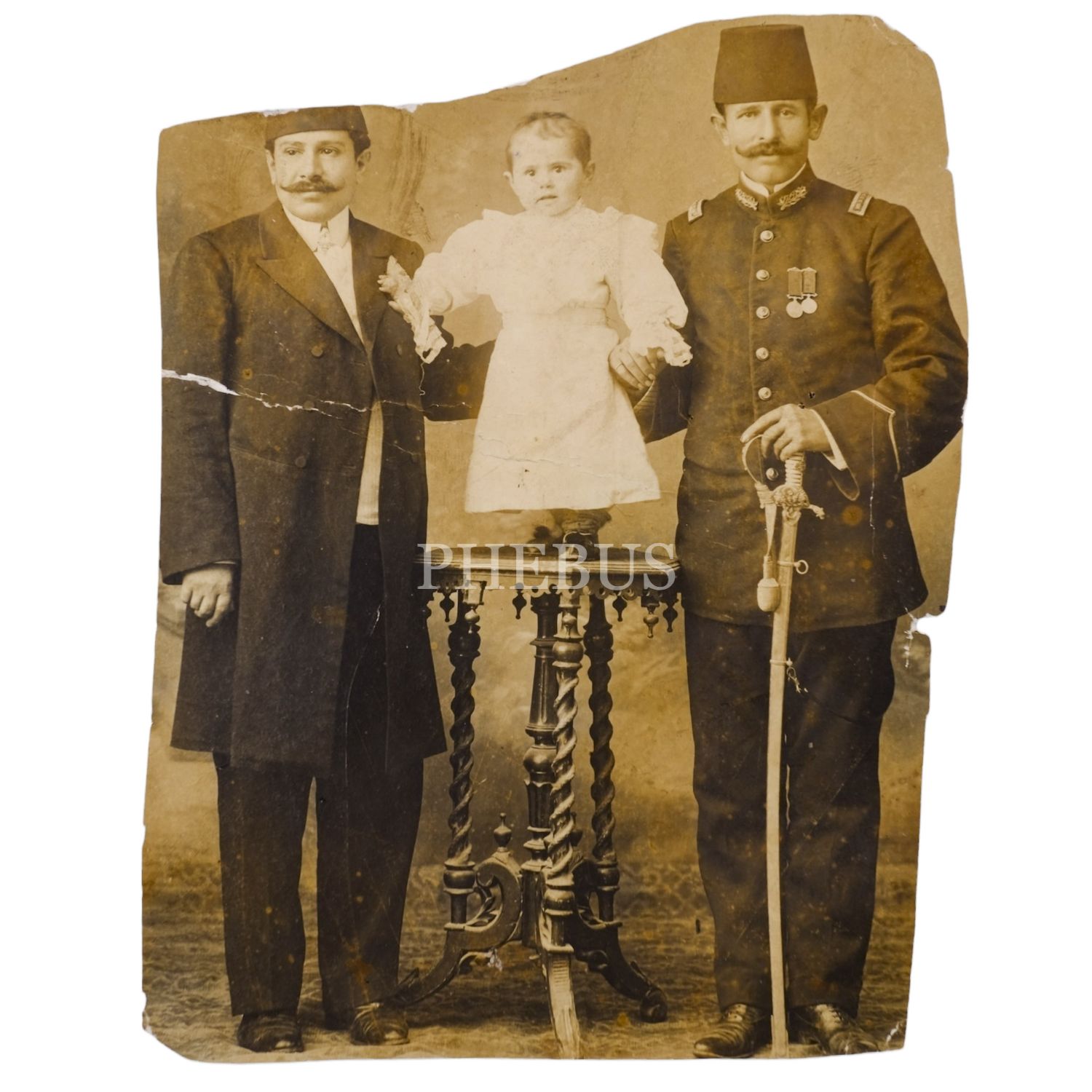 Biri subay, diğeri sivil iki Osmanlı erkeğinin arasındaki sehpaya çıkarılarak poz verdirilen sevimli bir kız çocuğu, 11x14 cm...