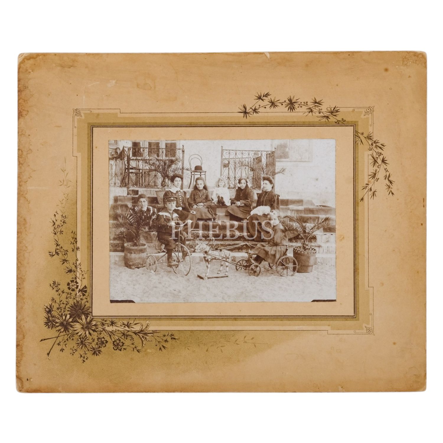 Bir Levanten ailenin çocukları, ebeveynleriyle birlikte, evlerinin bahçesinde kamera karşısında, fotoğraf 15,5x11 cm, paspartu 28x24 cm...