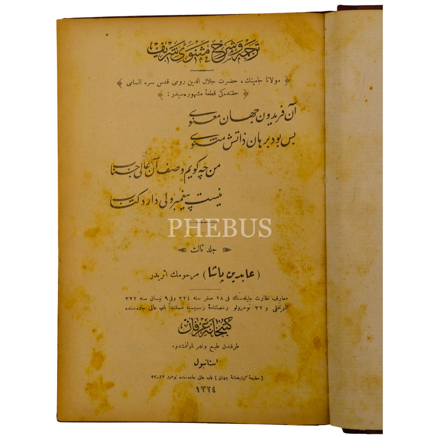 TERCÜME VE ŞERH-İ MESNEVİ-İ ŞERİF, 3. CİLT, Mevlana Celaleddin Rumi, (çeviren: Abidin Paşa), 1324, Matbaa ve Kütüphane-i Cihan, 269 sayfa, 17x24 cm...