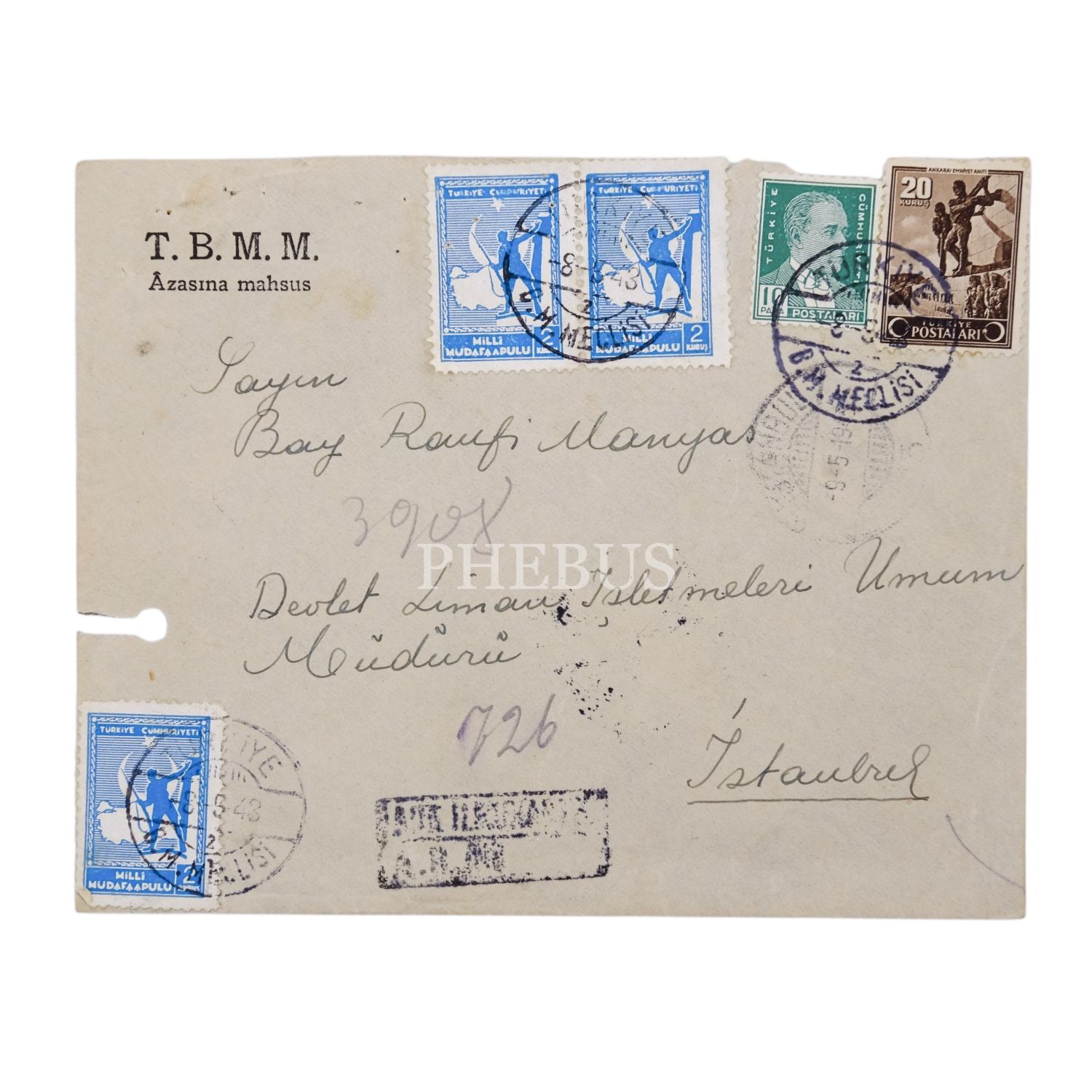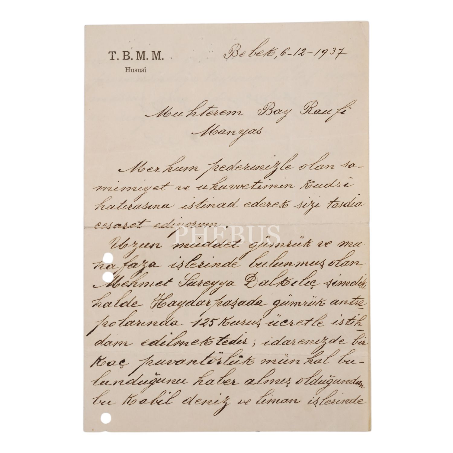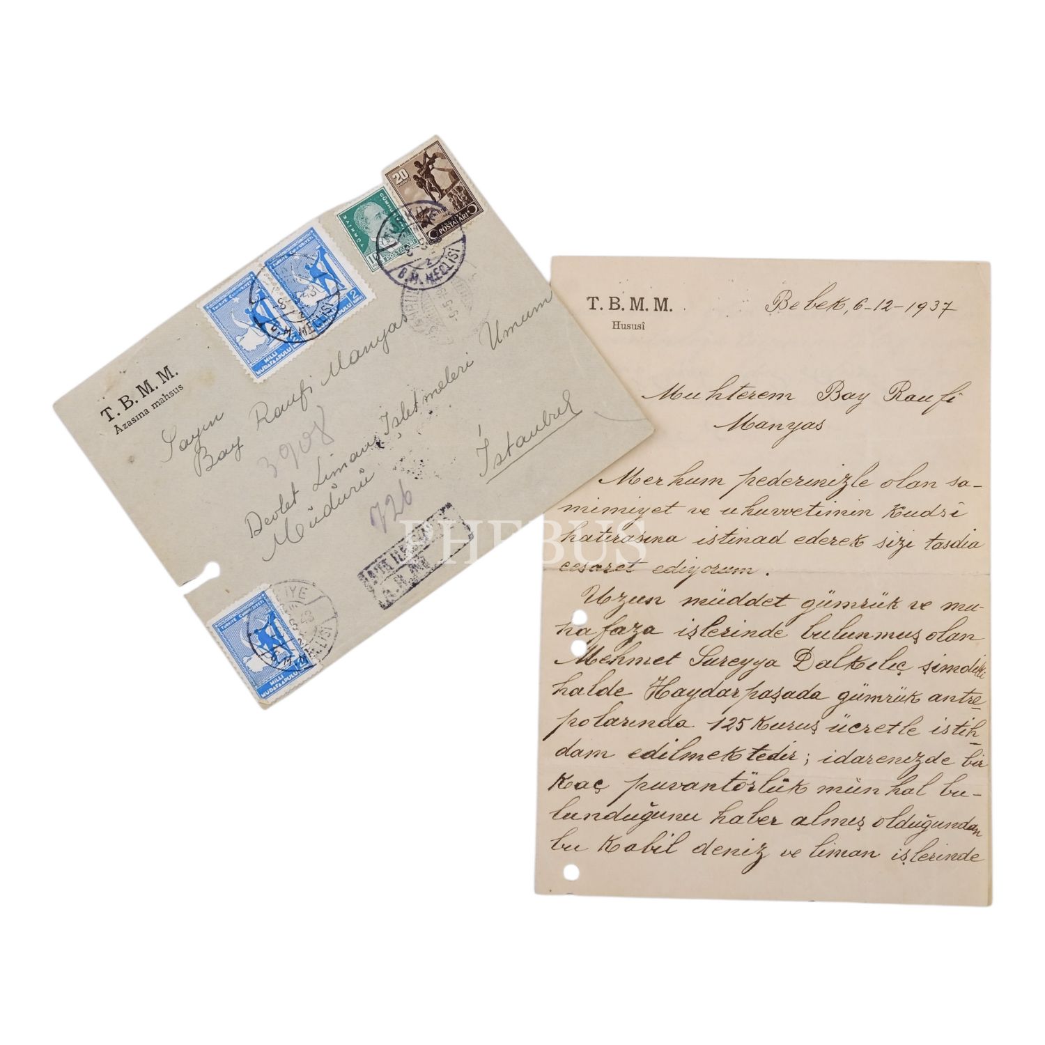 Mithat Şükrü Bleda tarafından Devlet Limanlar İşletmesi Müdürü Raufi Manyas´a gönderilmiş, "T.B.M.M. Hususî" antetli kâğıda kaleme alınmış mektup ve zarfı, 6 Aralık 1937, mektup 14x21 cm, zarf 16x12 cm...