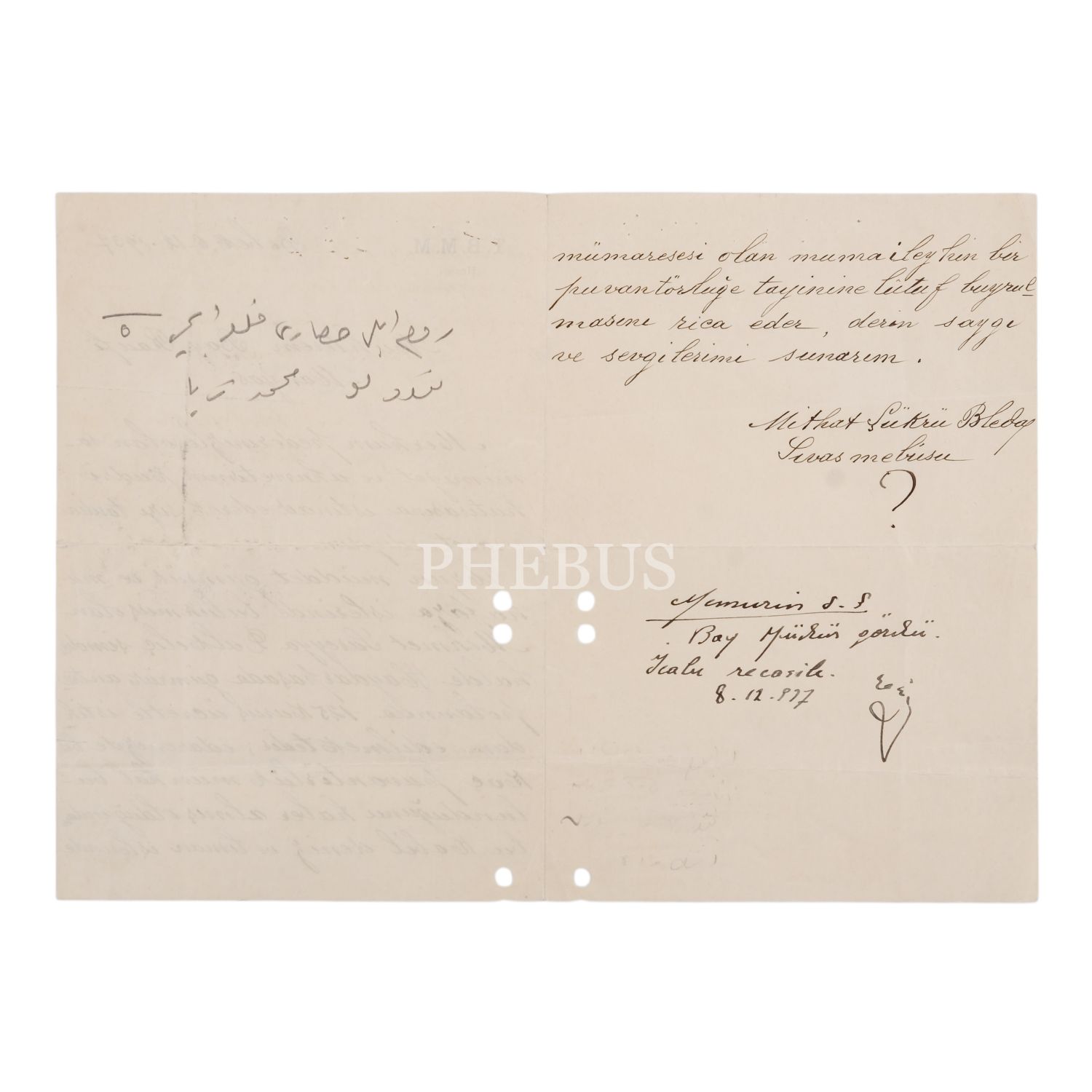 Mithat Şükrü Bleda mektubunda, uzun müddet gümrük ve muhafaza işlerinde bulunmuş olan ve o sıralar Haydarpaşa Gümrük Antreposunda çalışmakta olan Mehmet Süreyya Dalkılıç isimli beyefendinin tayin edilmesini rica etmektedir.