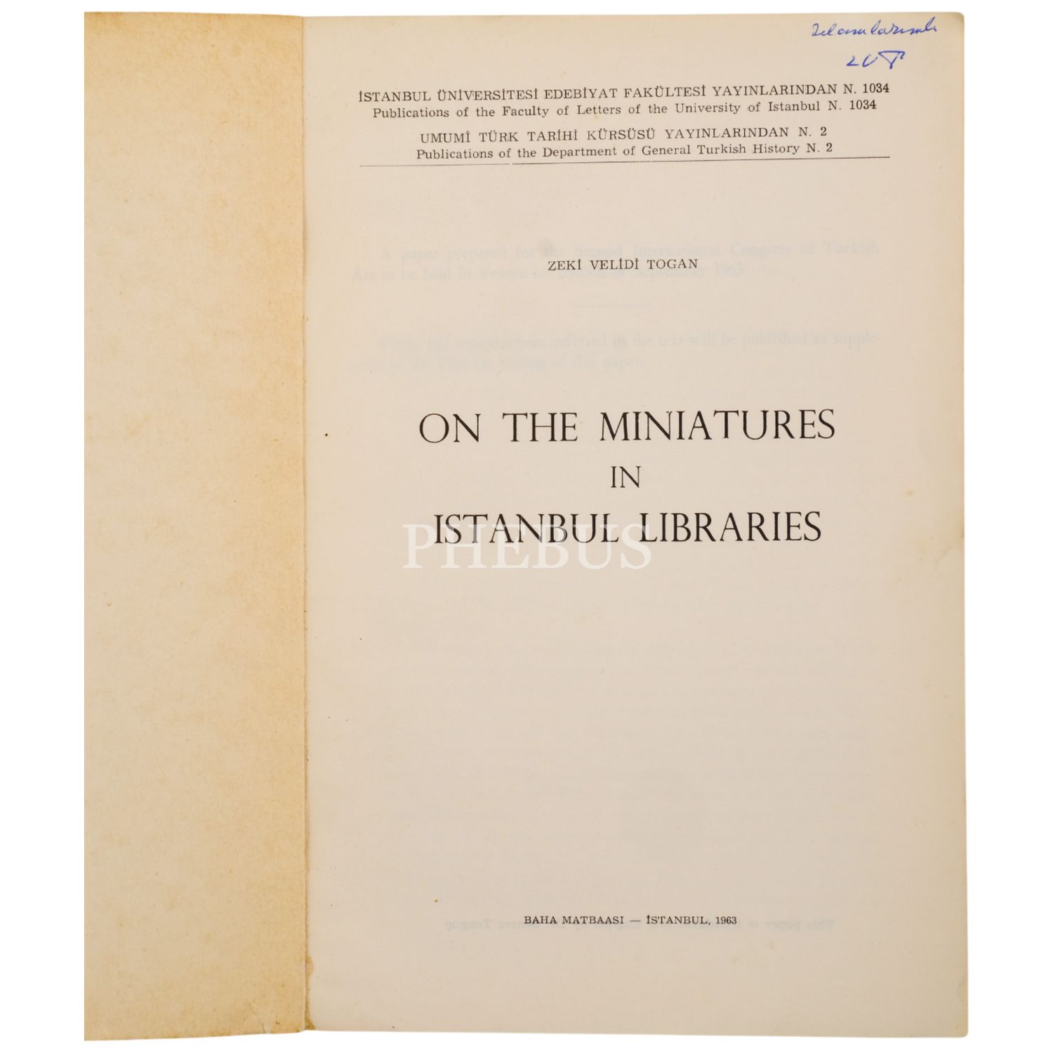 ON THE MINIATURES IN ISTANBUL LIBRARIES, Zeki Velidi Togan, 1963, Baha Matbaası, 68 sayfa, 17x24 cm...