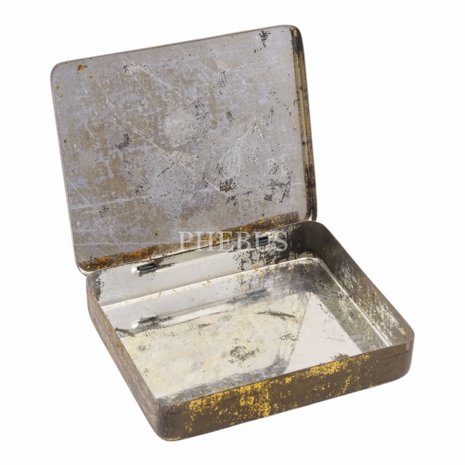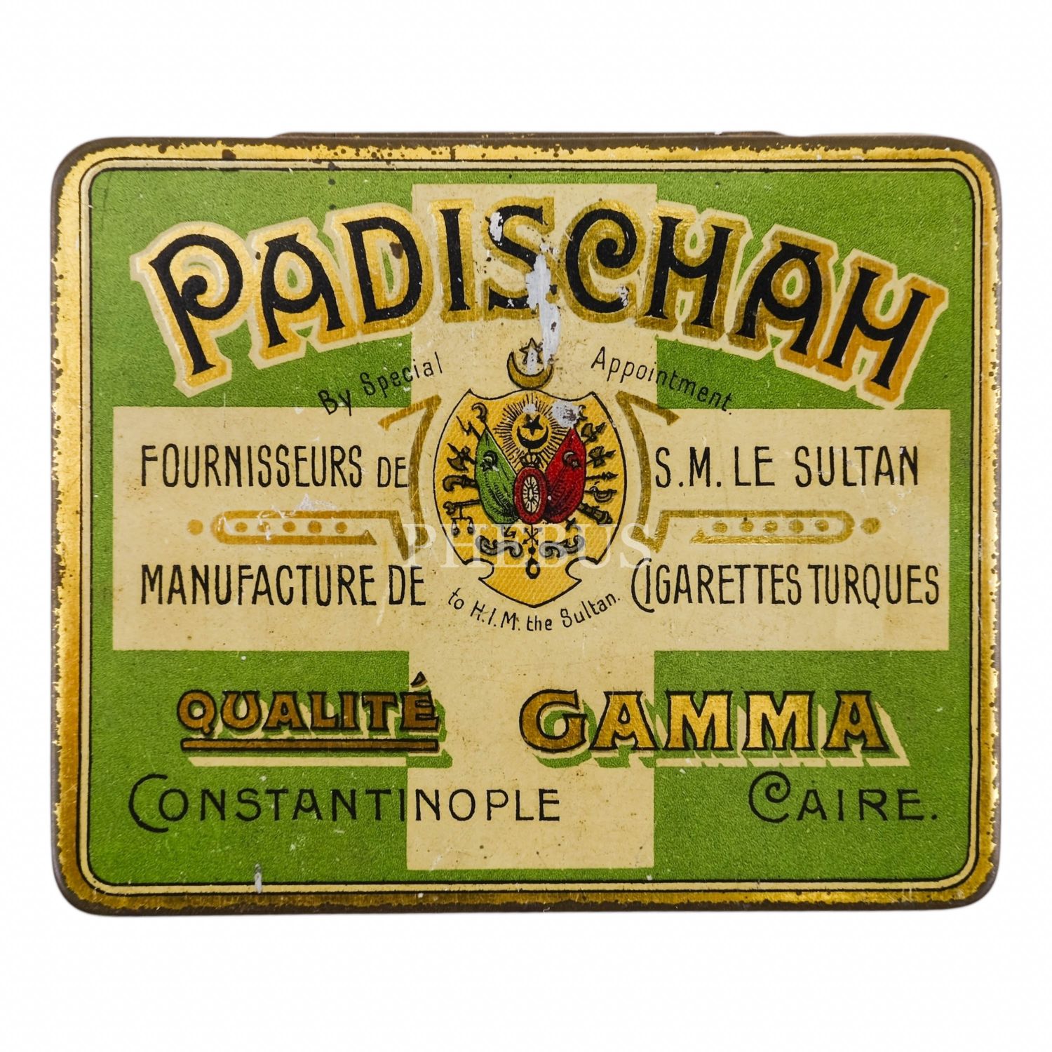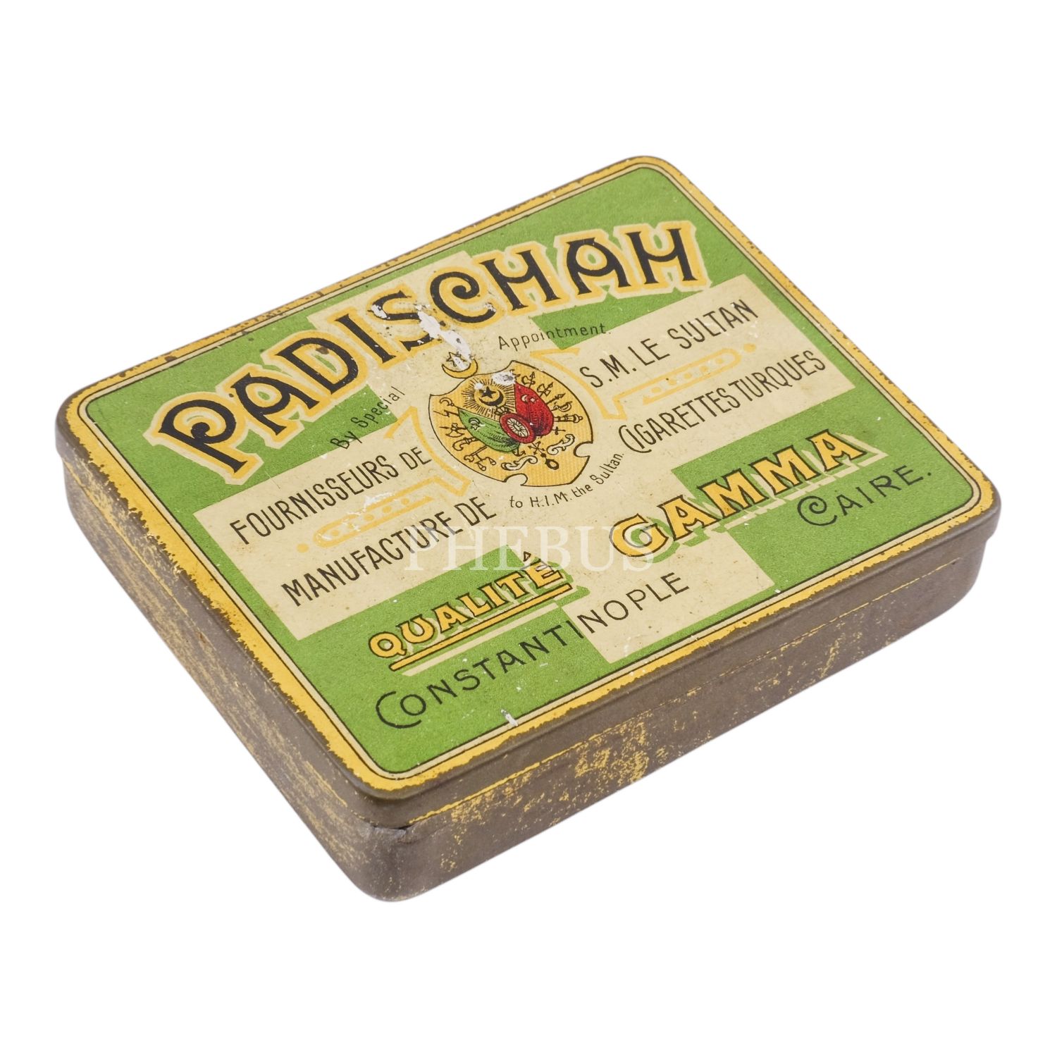 Osmanlı dönemi Mısır´da üretilen, Osmanlı armalı, "Constantinople" ve "Caire" yazılı "PADISCHAH" marka teneke sigara kutusu, 9x7x2 cm.