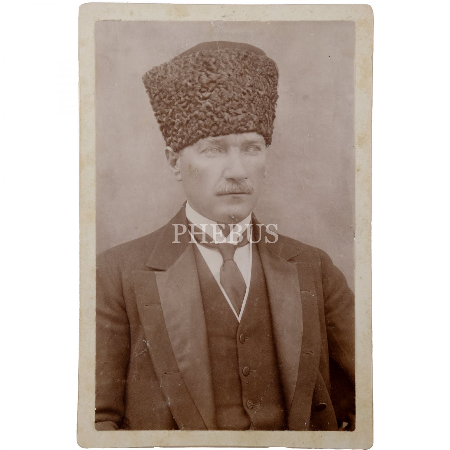 Mustafa Kemal Atatürk'ün, sivil kıyafetli, kalpaklı bir portre kabin fotoğrafı, 12x19 cm...