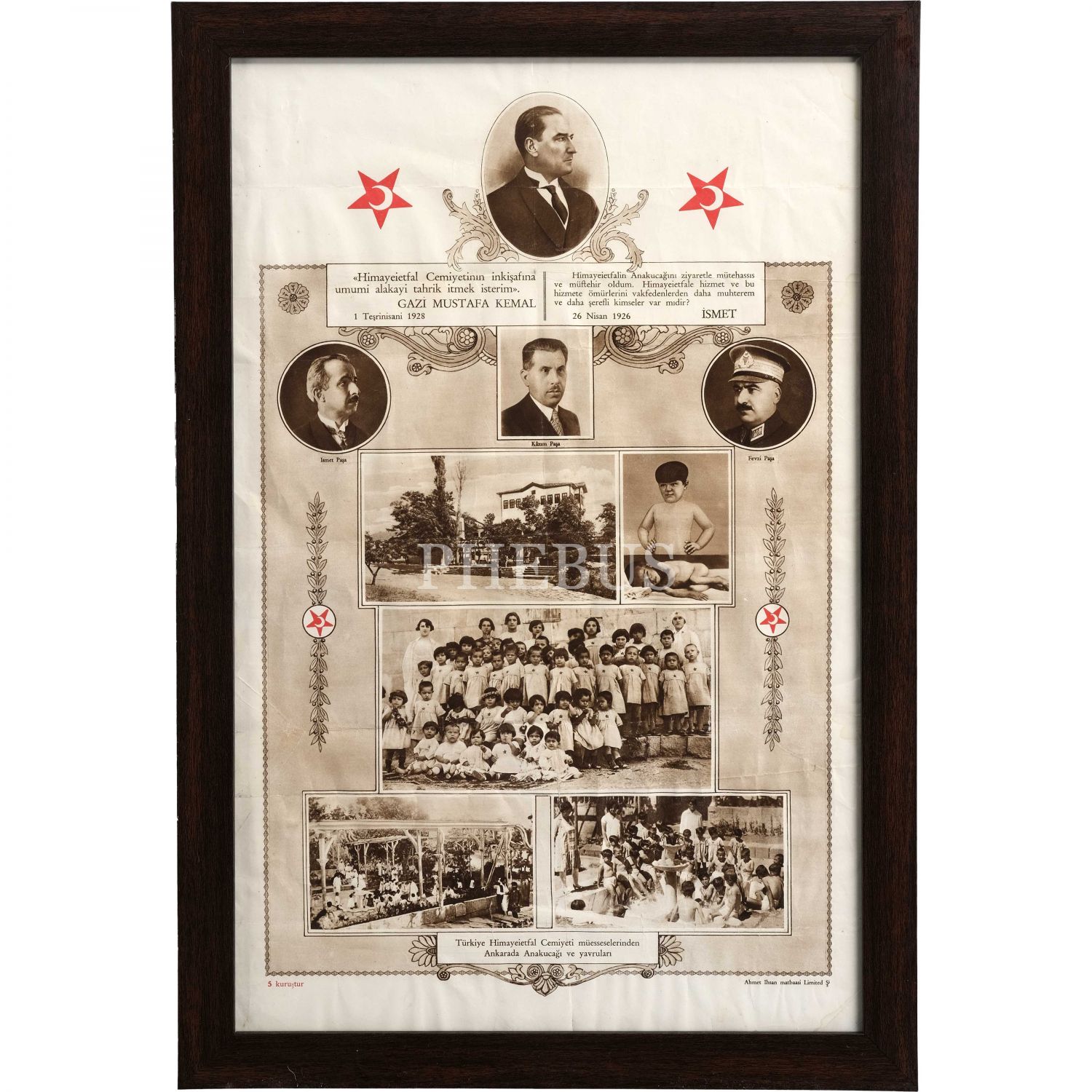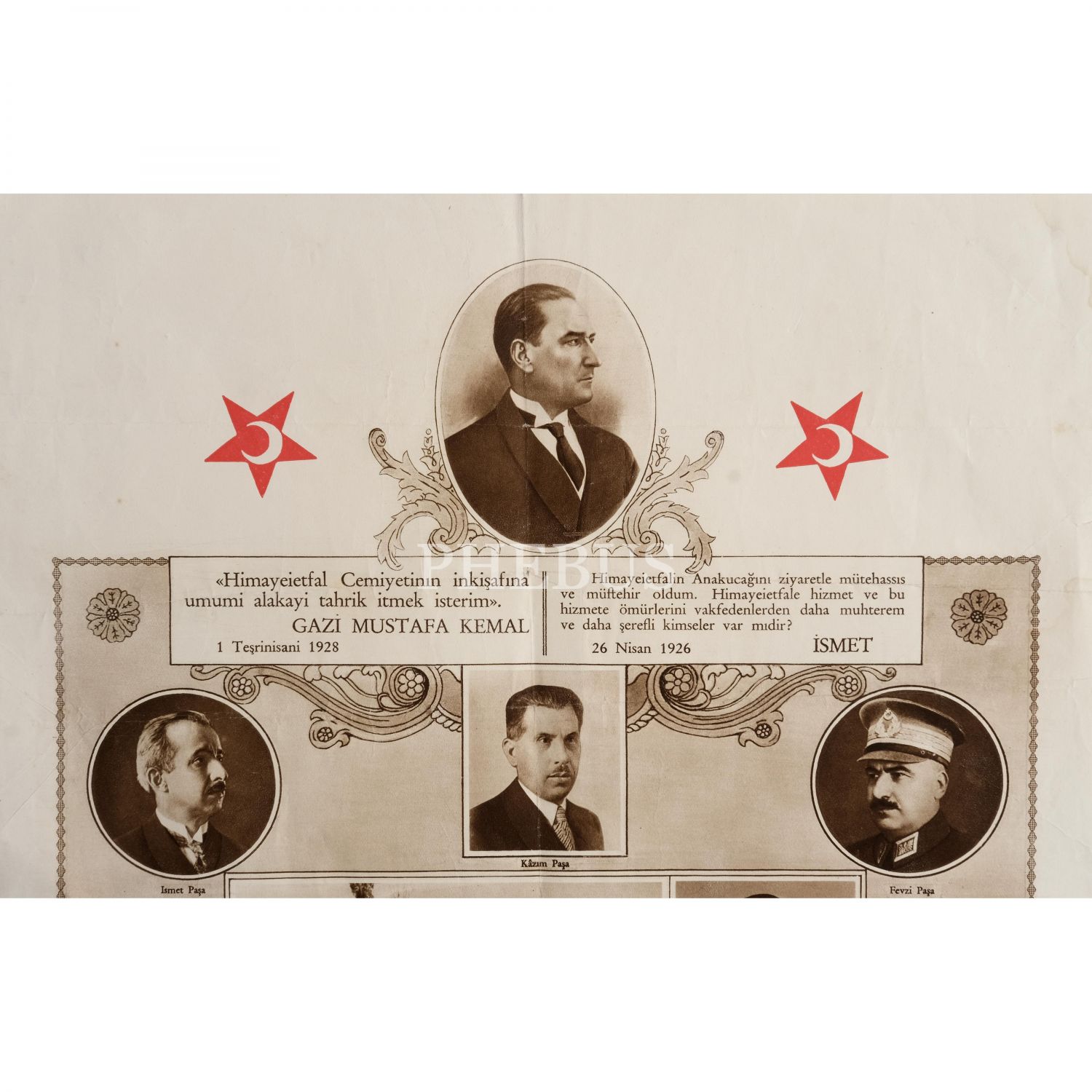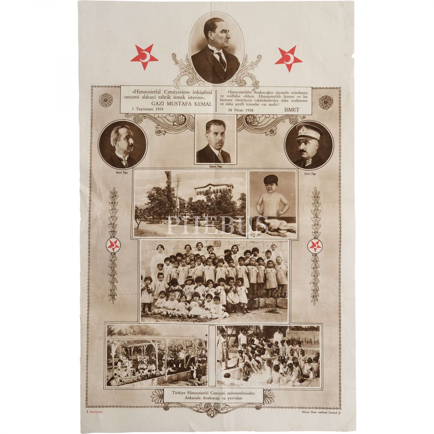 Himaye-i Etfal Cemiyeti tarafından hazırlanmış; Mustafa Kemal Atatürk, İsmet İnönü, Fevzi Çakmak ve Kazım Özalp portreleriyle birlikte cemiyetin Ankara´da yer alan bir şubesinden çeşitli fotoğrafların yer aldığı afiş, Ahmet İhsan Matbaası, 32x49 cm...