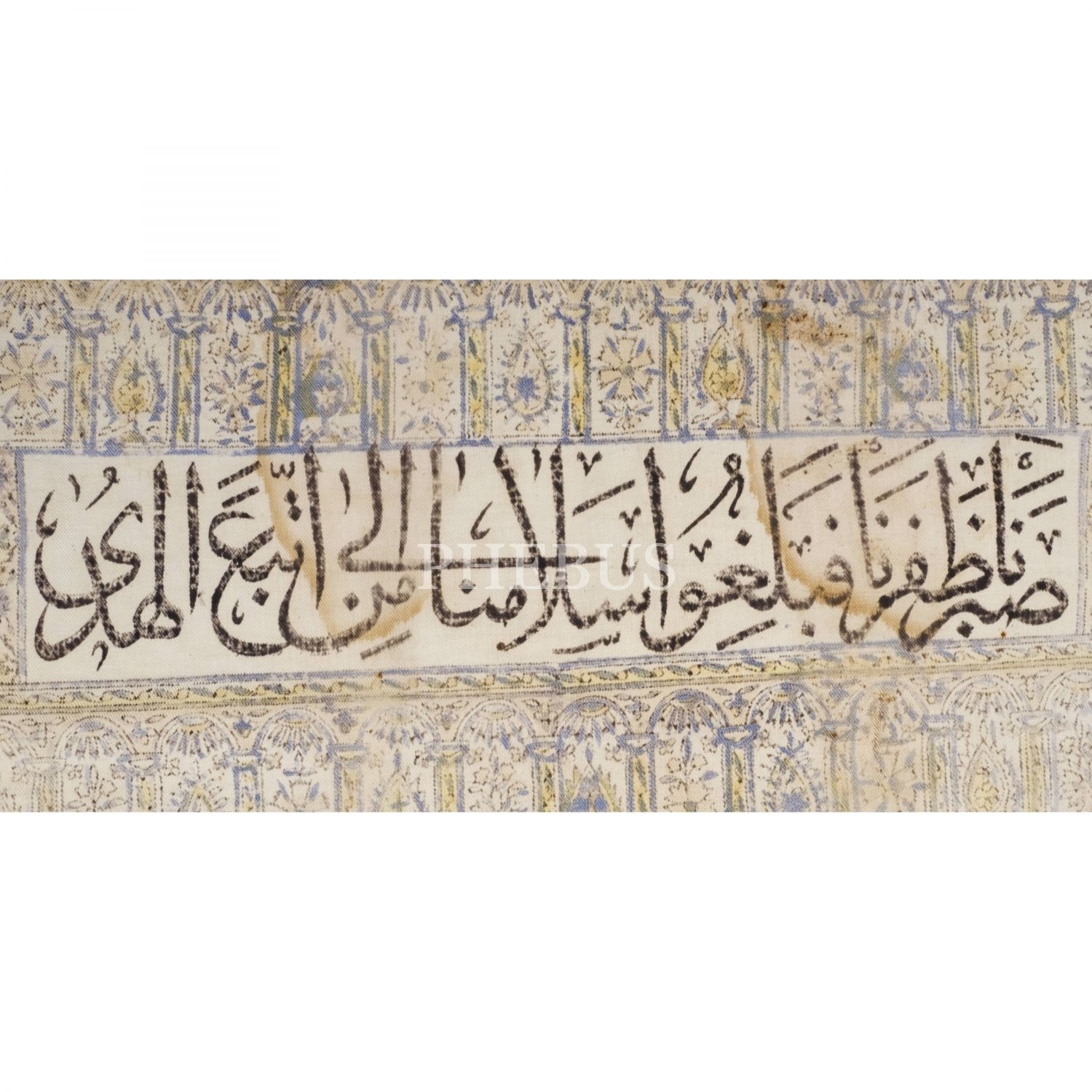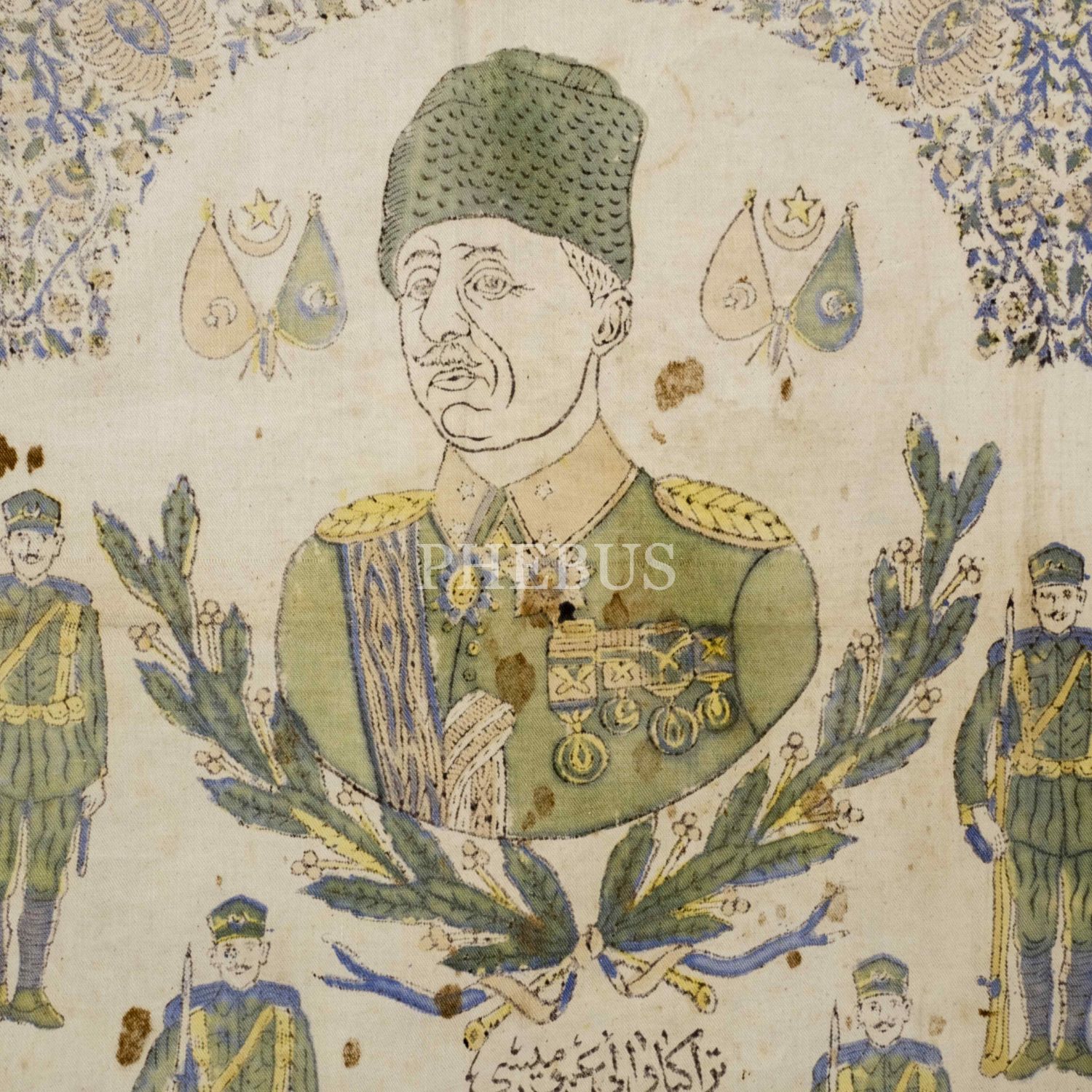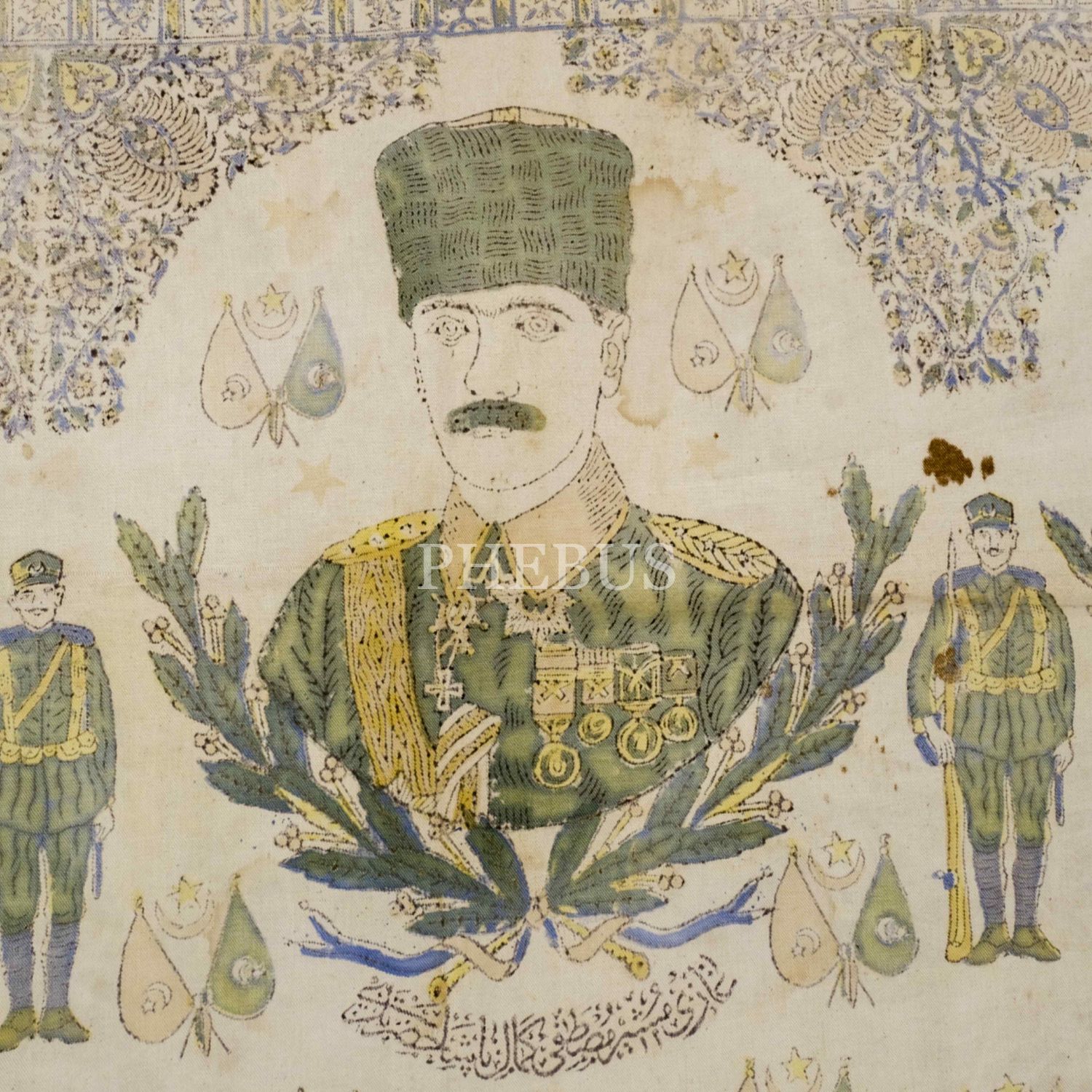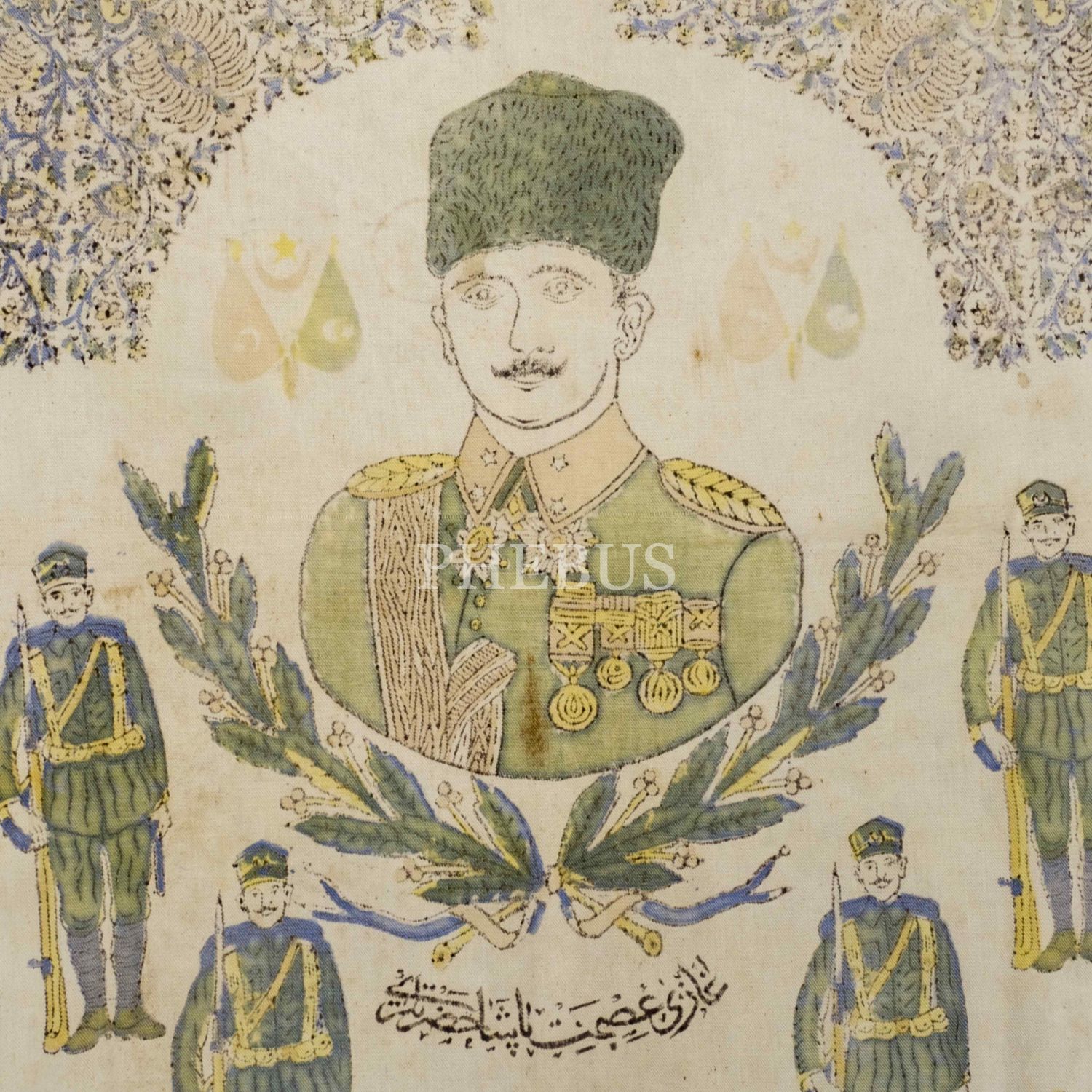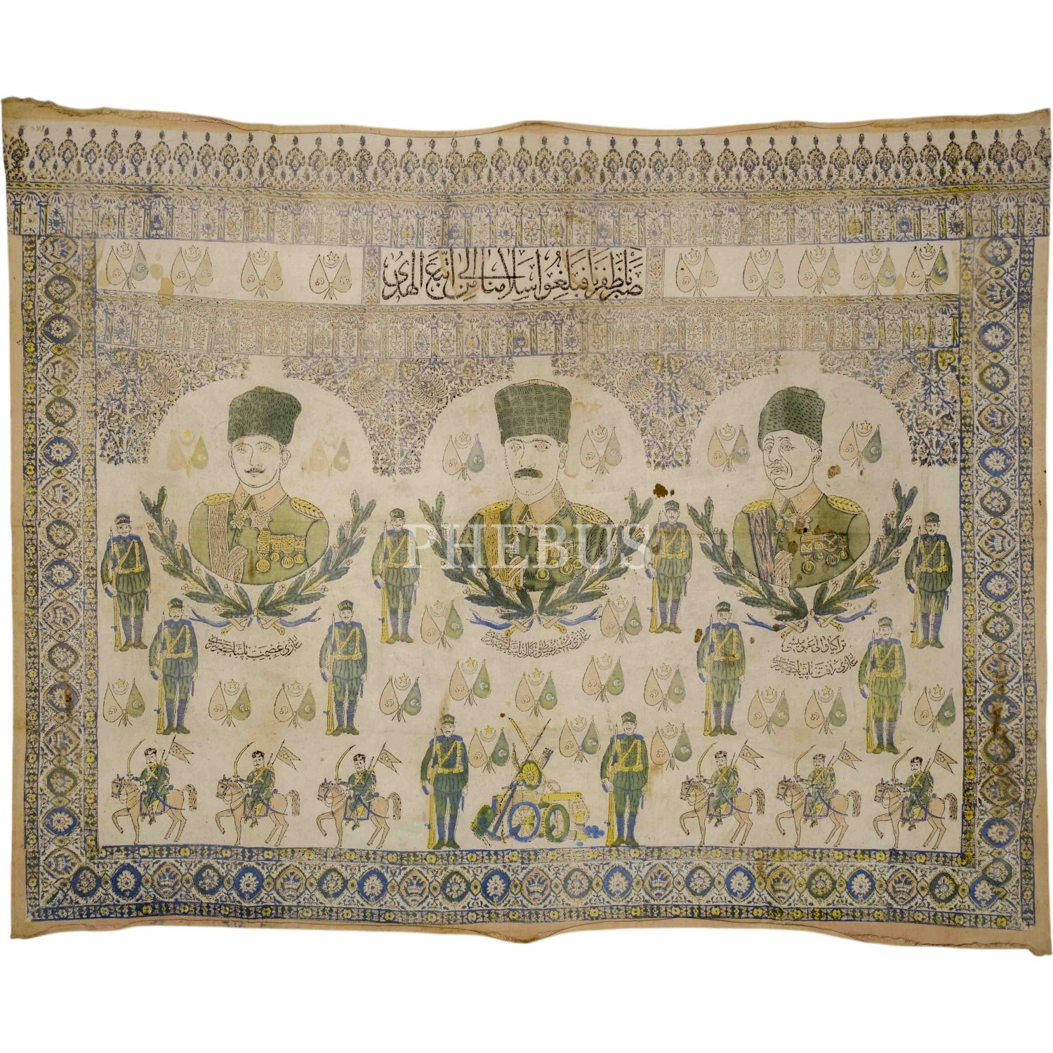 "Gazi Müşir Mustafa Kemal Paşa Hazretleri, Gazi İsmet Paşa Hazretleri, Türkiye Vali-i Umumisi Gazi Refet Bele Paşa Hazretleri" ve "Saberna zaferna fe belliğu selamena ilâ men ittebea'l-hüda..." (Sabrettik ve zafere ulaştık, selamımızı doğru yolda gidenlere iletin.) yazılı tekstil üzerine elle renklendirimiş pano, 157x128 cm...