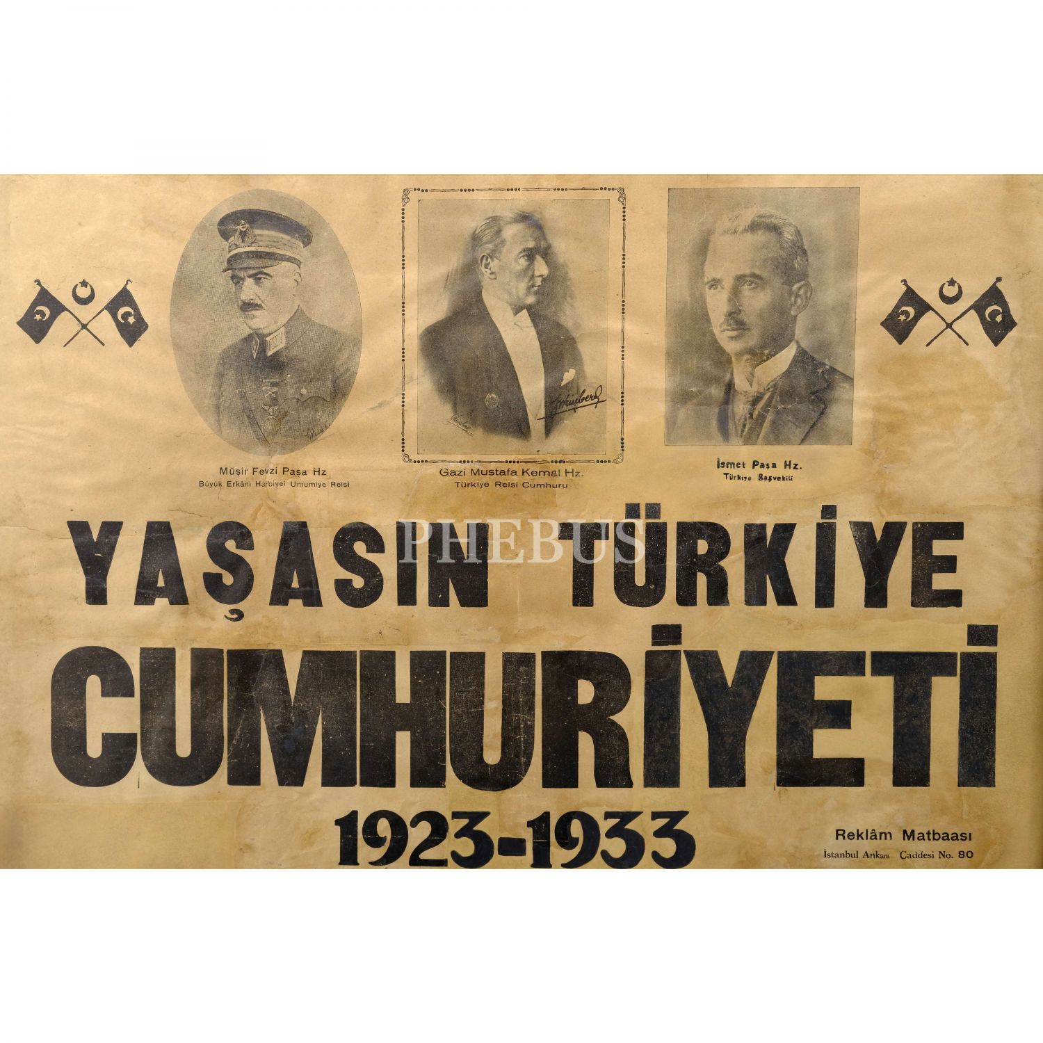 Türkiye Cumhuriyeti´nin kuruluşunun 10. yıldönümü hatırasına yayımlanan, Mustafa Kemal Atatürk, Fevzi Çakmak ve İsmet İnönü´nün fotoğraflarına ve "Yaşasın Türkiye Cumhuriyeti 1923-1933" sloganına yer verilen afiş, Reklam Matbaası, 6147 cm...