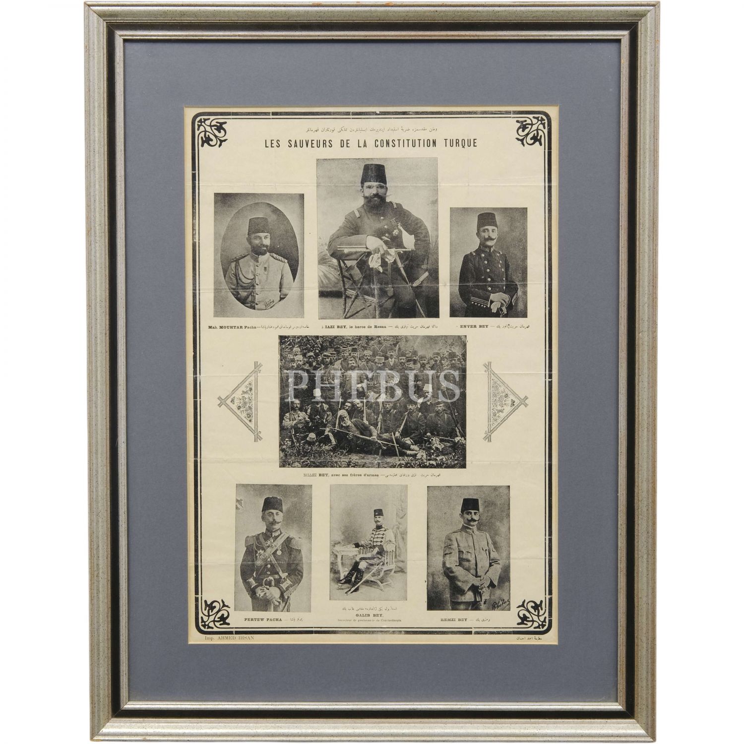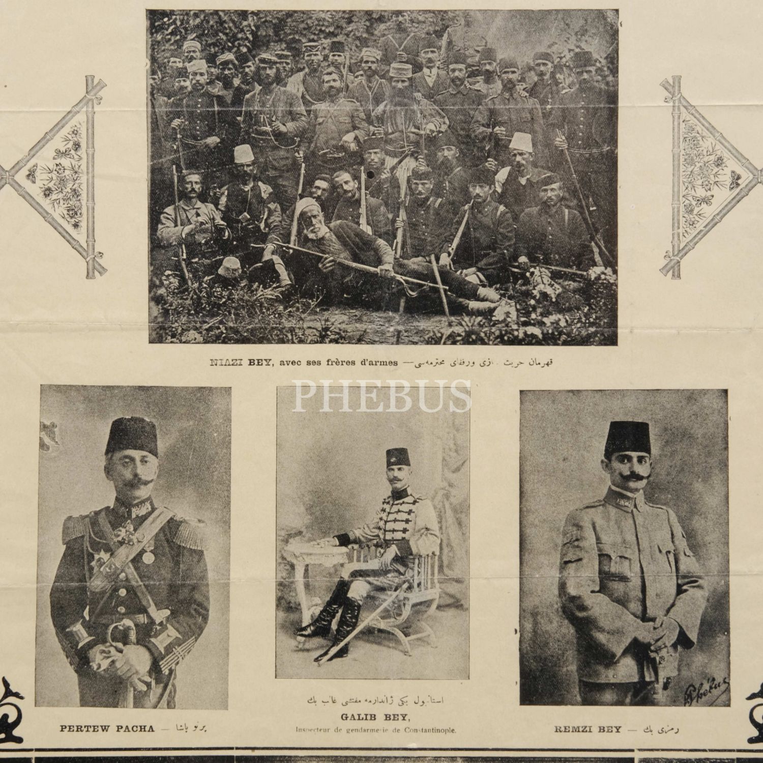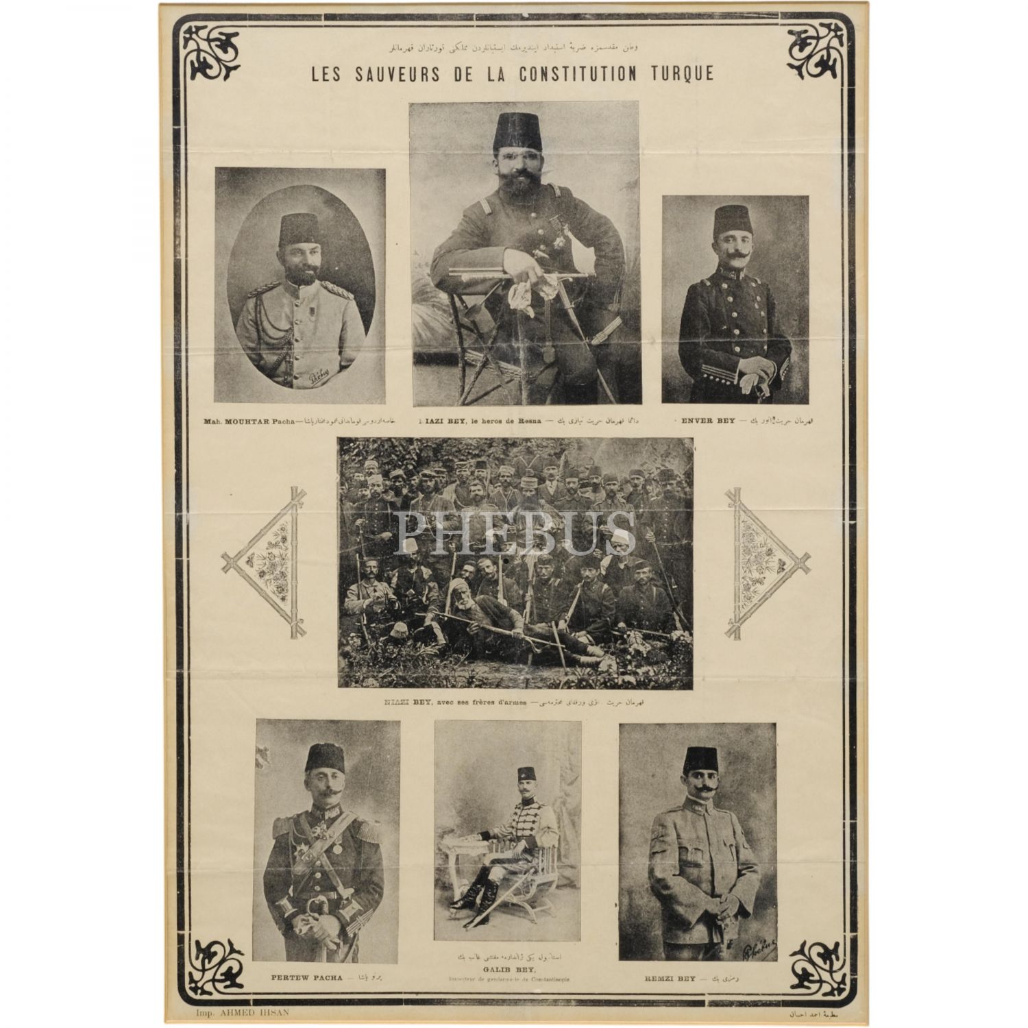 "Vatan-ı Mukaddesi´mize darbe-i istibdat indirmek isteyenlerden memleketi kurtaran kahramanlar" başlığıyla, Enver Paşa, Resneli Niyazi, Mahmud Muhtar Paşa, Pertev Paşa, Galip Bey ve Remzi Bey´in fotoğraflarına yer verilen Osmanlıca ve Fransızca açıklamalı afiş, Matbaa-i Ahmed İhsan, 33x49 cm...