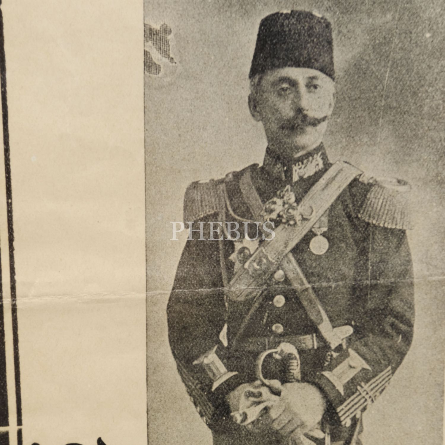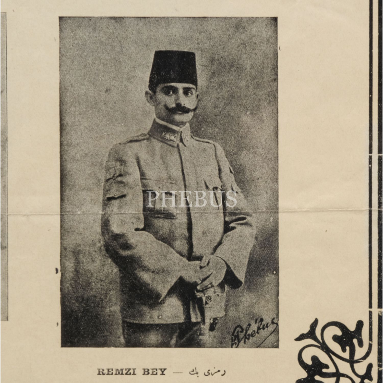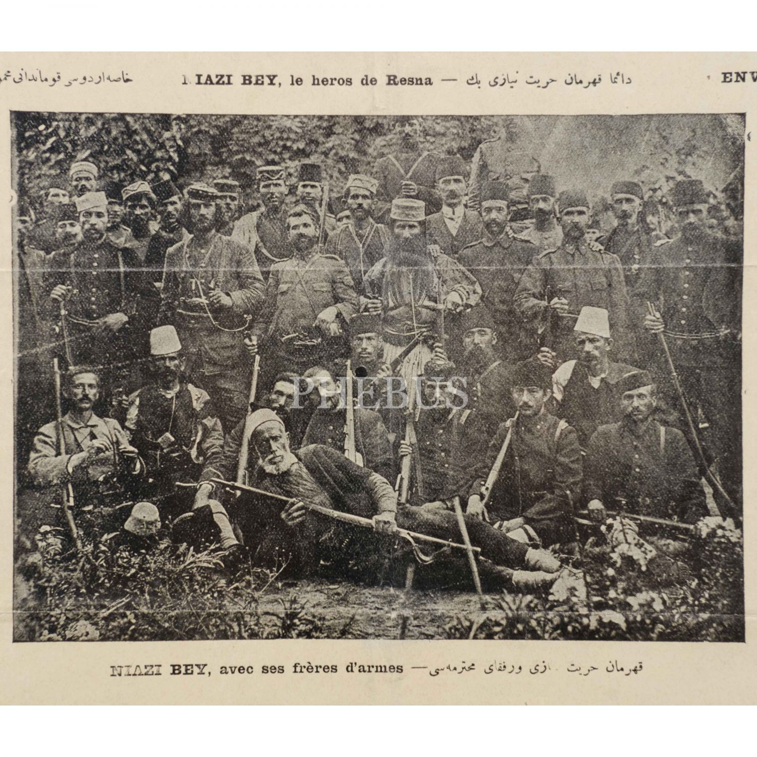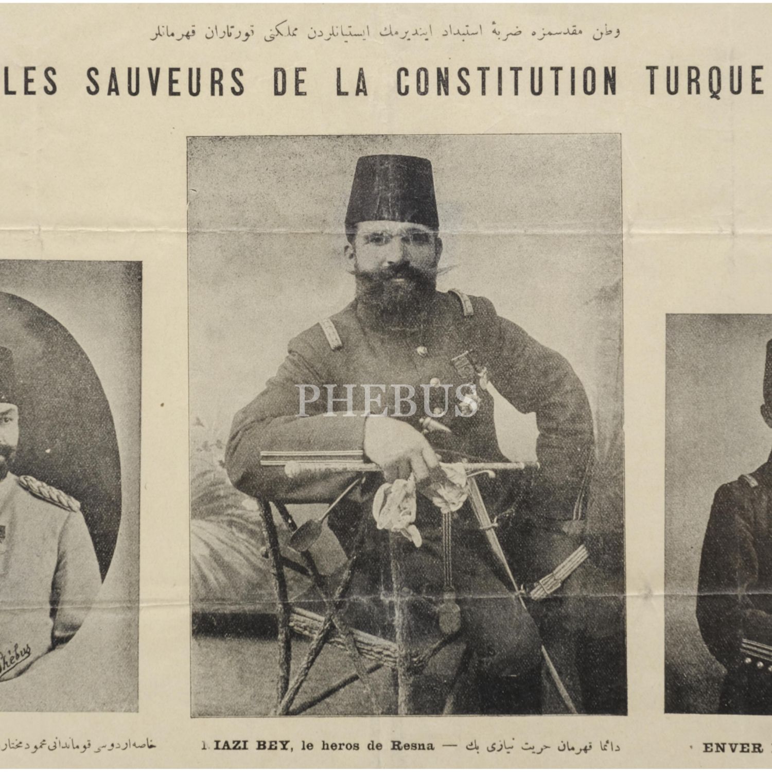 "Vatan-ı Mukaddesi´mize darbe-i istibdat indirmek isteyenlerden memleketi kurtaran kahramanlar" başlığıyla, Enver Paşa, Resneli Niyazi, Mahmud Muhtar Paşa, Pertev Paşa, Galip Bey ve Remzi Bey´in fotoğraflarına yer verilen Osmanlıca ve Fransızca açıklamalı afiş, Matbaa-i Ahmed İhsan, 33x49 cm...