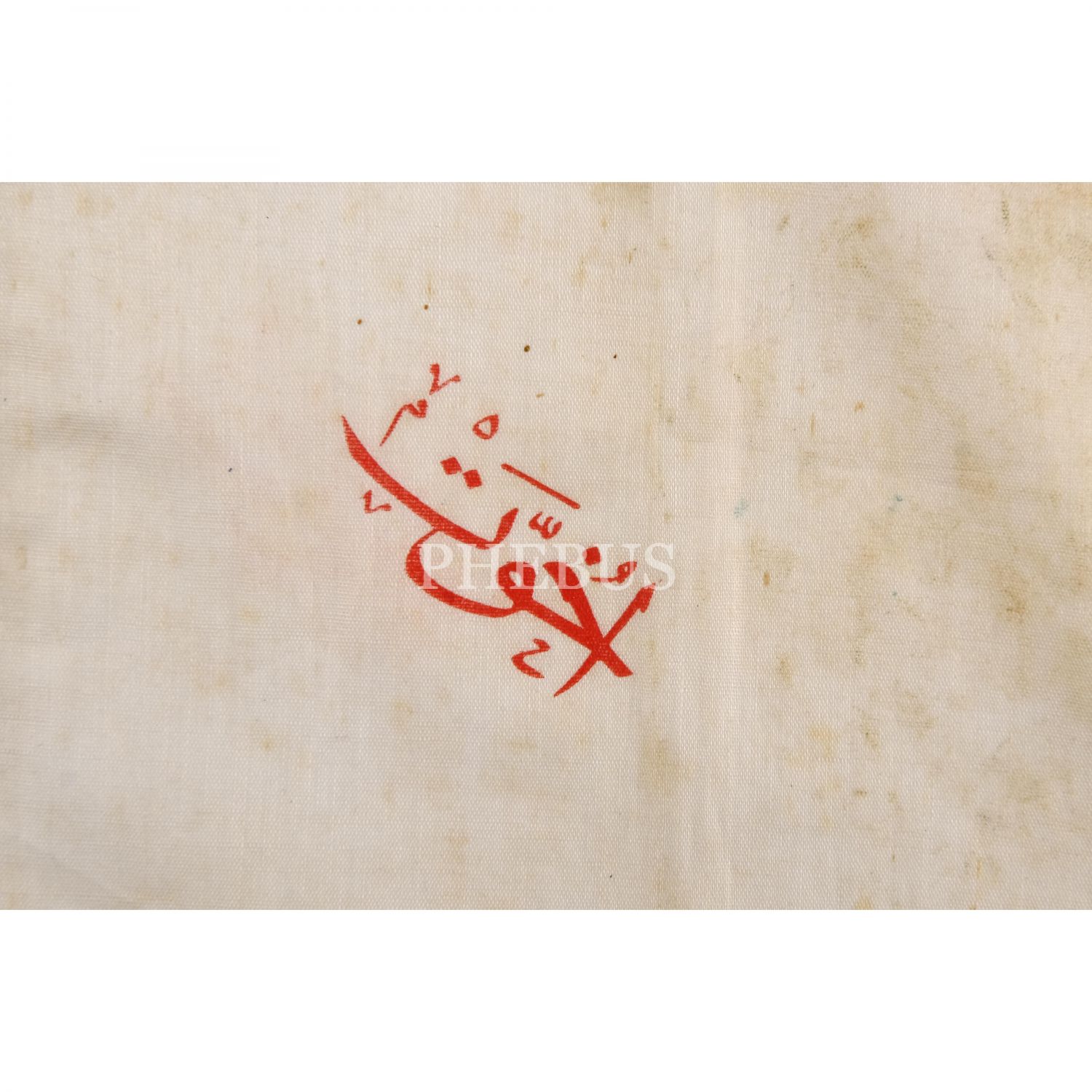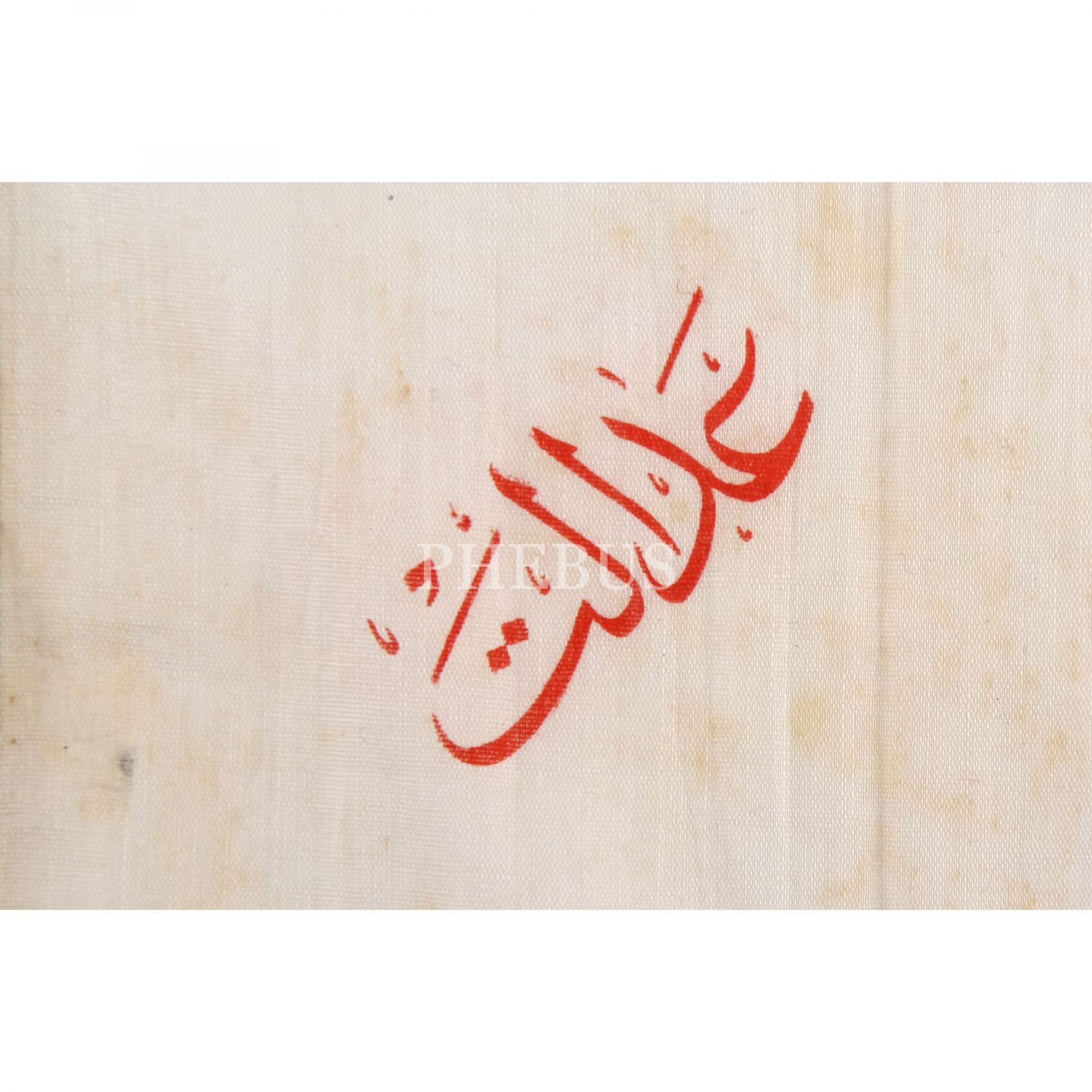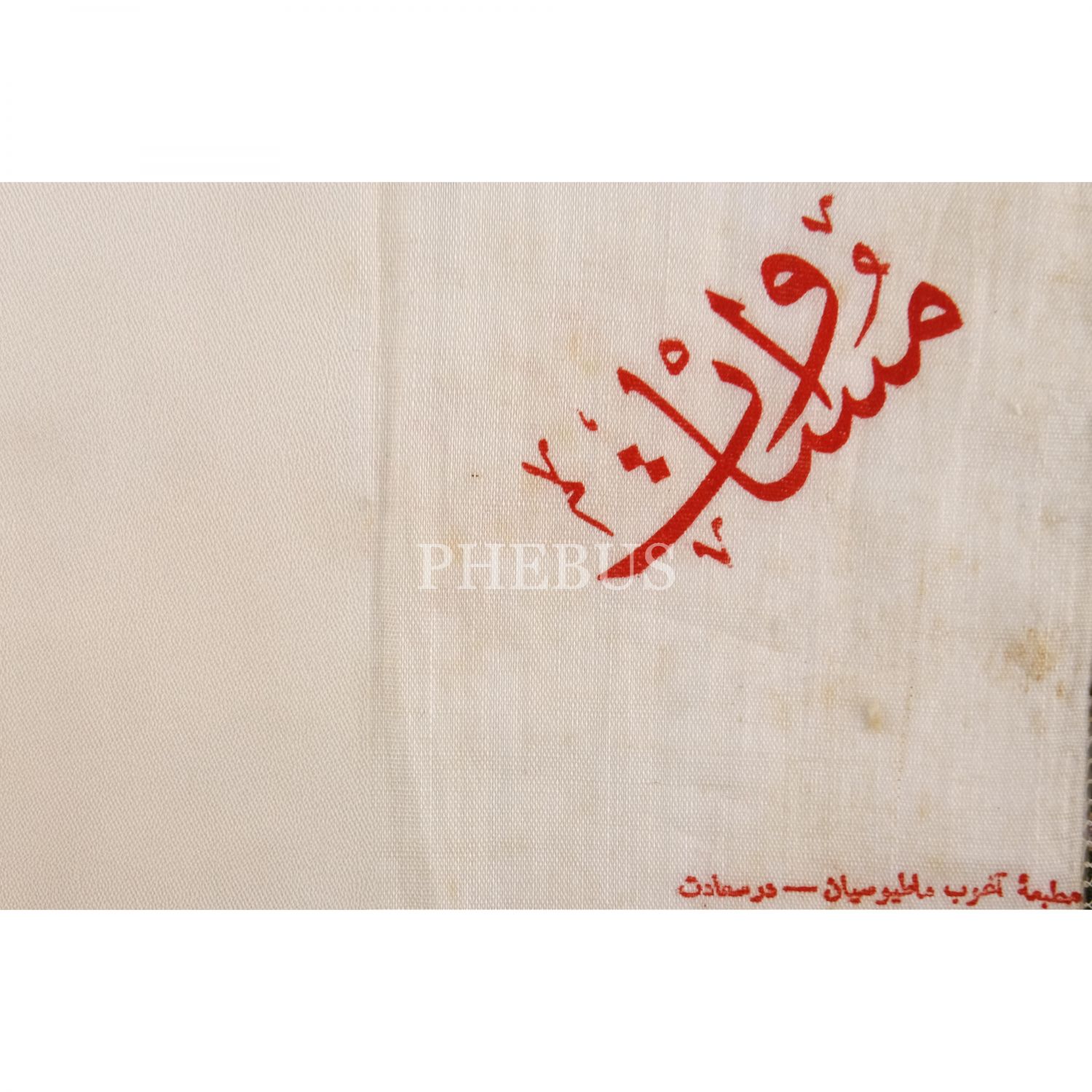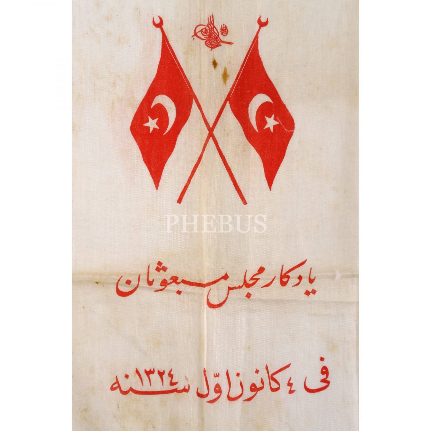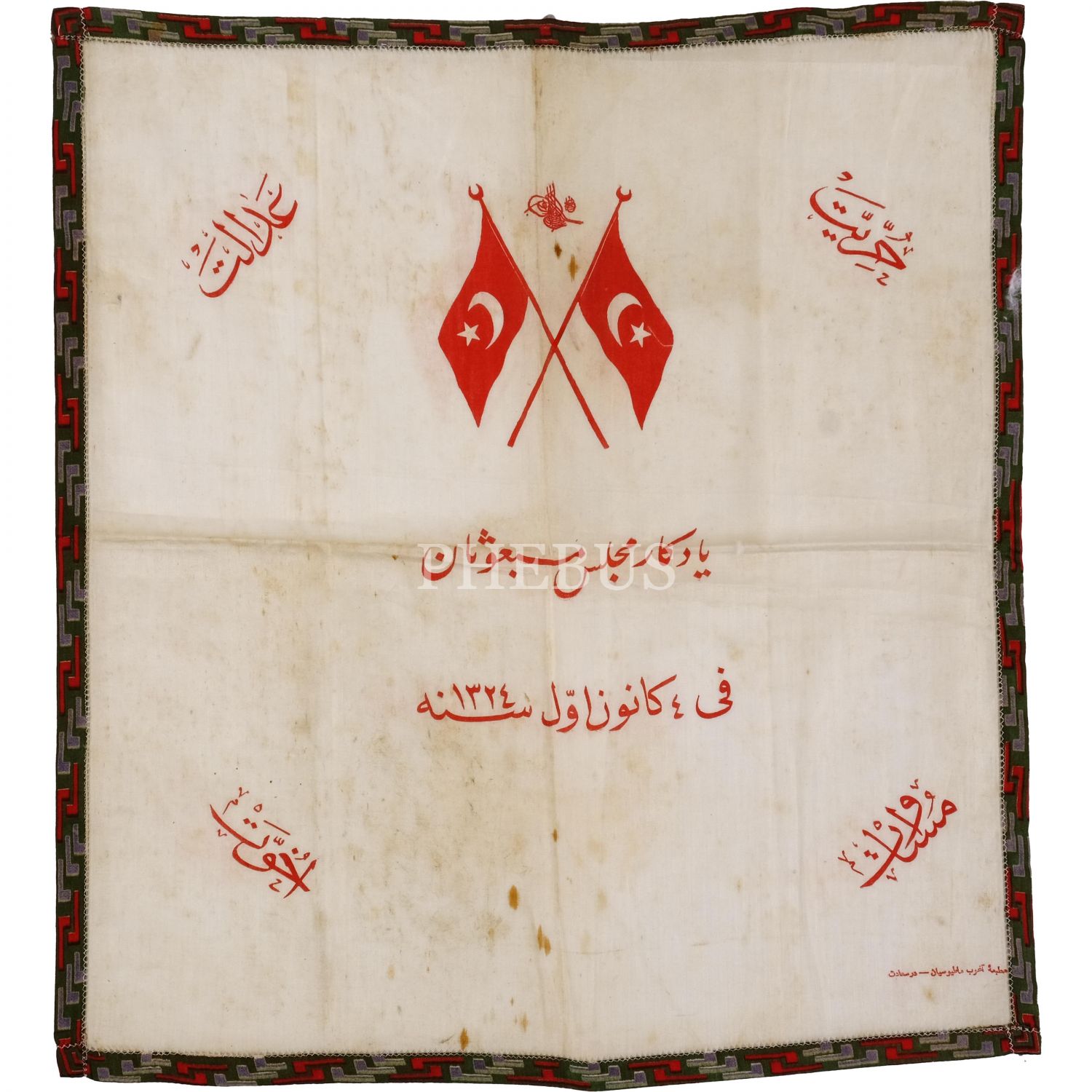 Meclis-i Mebusan'ın yeniden açılışı hatırasına dokunan, dört bir köşesinde "Adalet, Uhuvvet, Musavaat ve Hürriyet" yazılı ipek mendil, Matbaa-i Agop Matosyan, 30x32 cm...