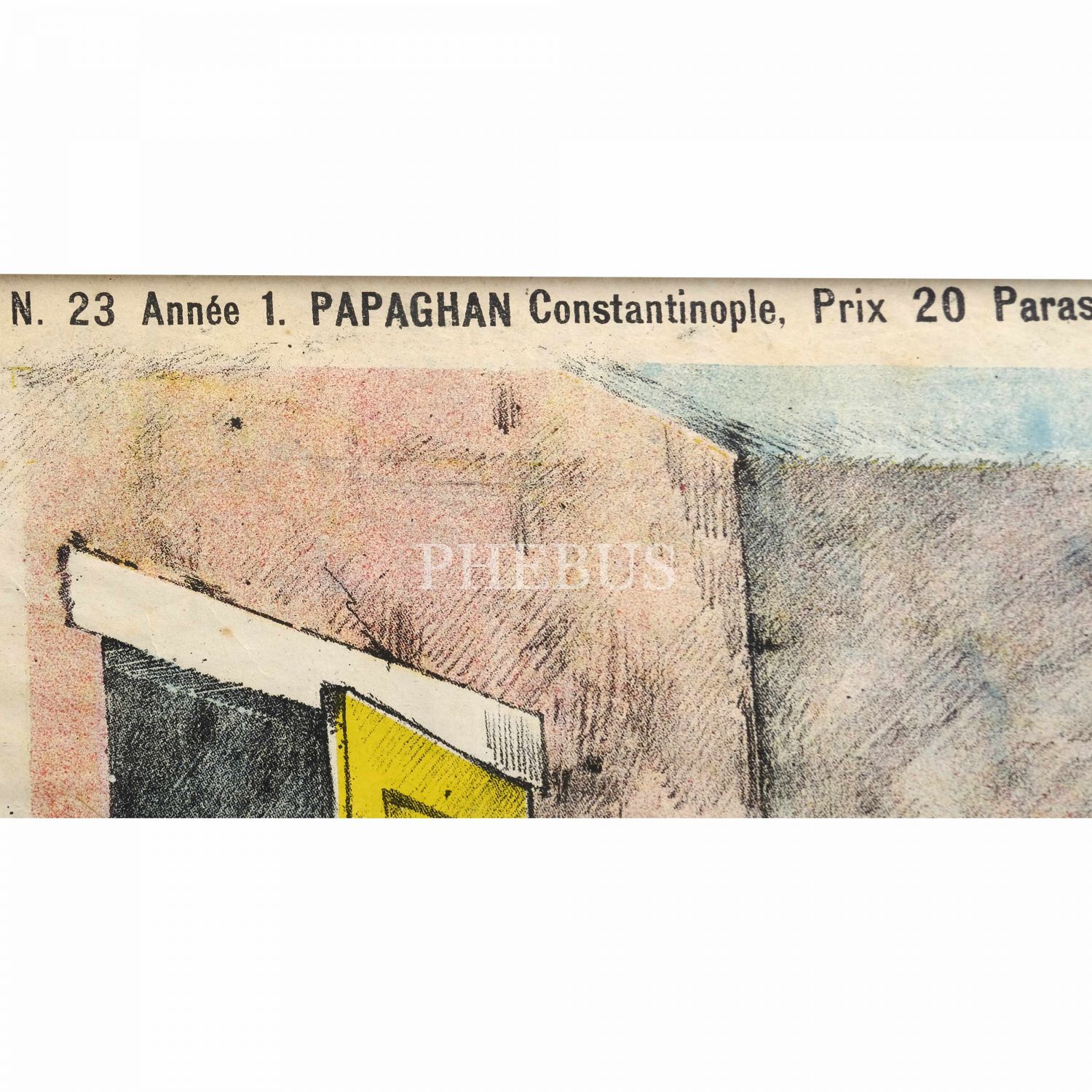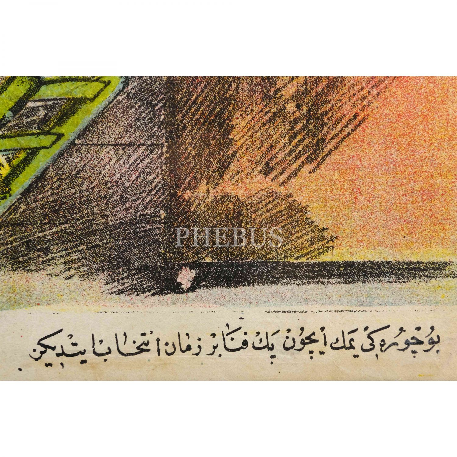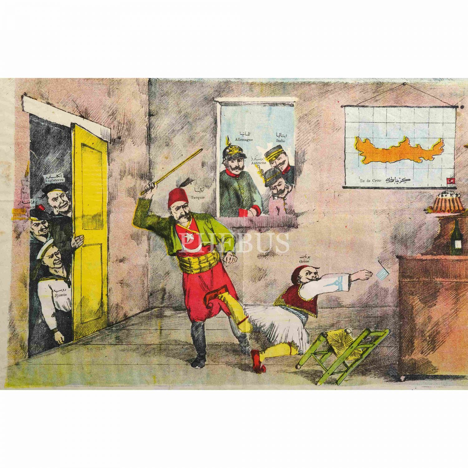 Musavver Papağan dergisinin 23. sayısında yayımlanan, Osmanlı ve Yunanistan arasında yaşanan Girit Adası gerginliğini konu alan illüstrasyonun yer aldığı afiş, 54x39 cm...