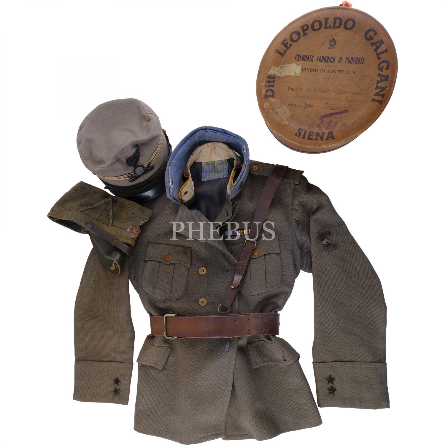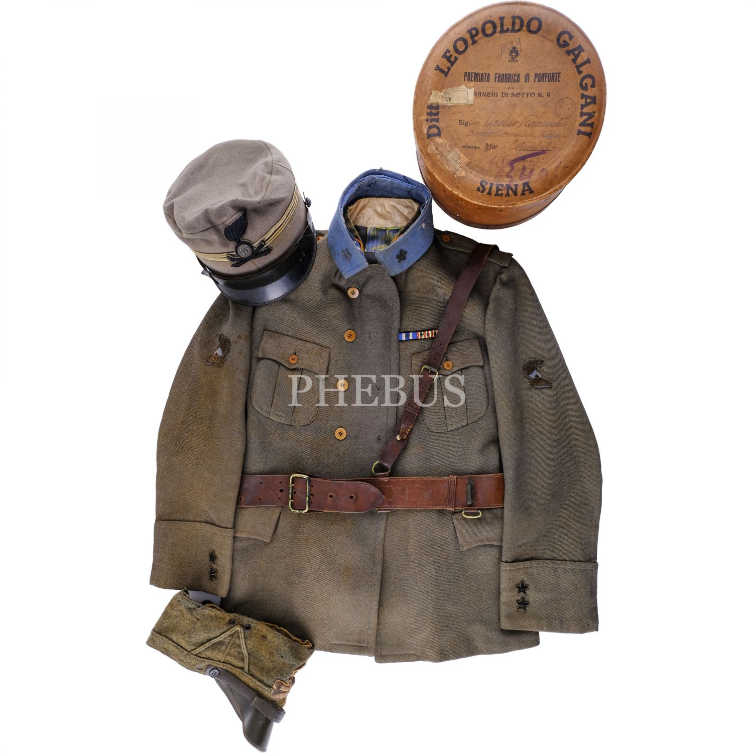 İstanbul, Birinci Dünya Savaşı'nın ardından İngiliz, Fransız ve İtalyanlarca işgal edilmiş; Beyoğlu ve Rumeli yakası İngilizler, İstanbul yakası Fransızlar ve Anadolu yakası İtalyanlar'ın kontrolüne bırakılmıştı. Müzayedemizde sunduğumuz üniforma, bu dönemde İstanbul'da bulunan bir İtalyan askerine aittir. Şapkaların konulduğu kutu üzerinde "Barettoni & Granotto - Milano" kabartma yazısı, kapağında "Ditto Leopoldo Galgani - Premiata Fabrica di Panforte, Banchi di Sotto N. 4 / Siena" ibareli firma reklamı mevcuttur. Cekette "Venezia" ibareli bir üretici etiketi (tamamı okunamadı) mevcuttur. *Şapkalardan biri yıpranmıştır.