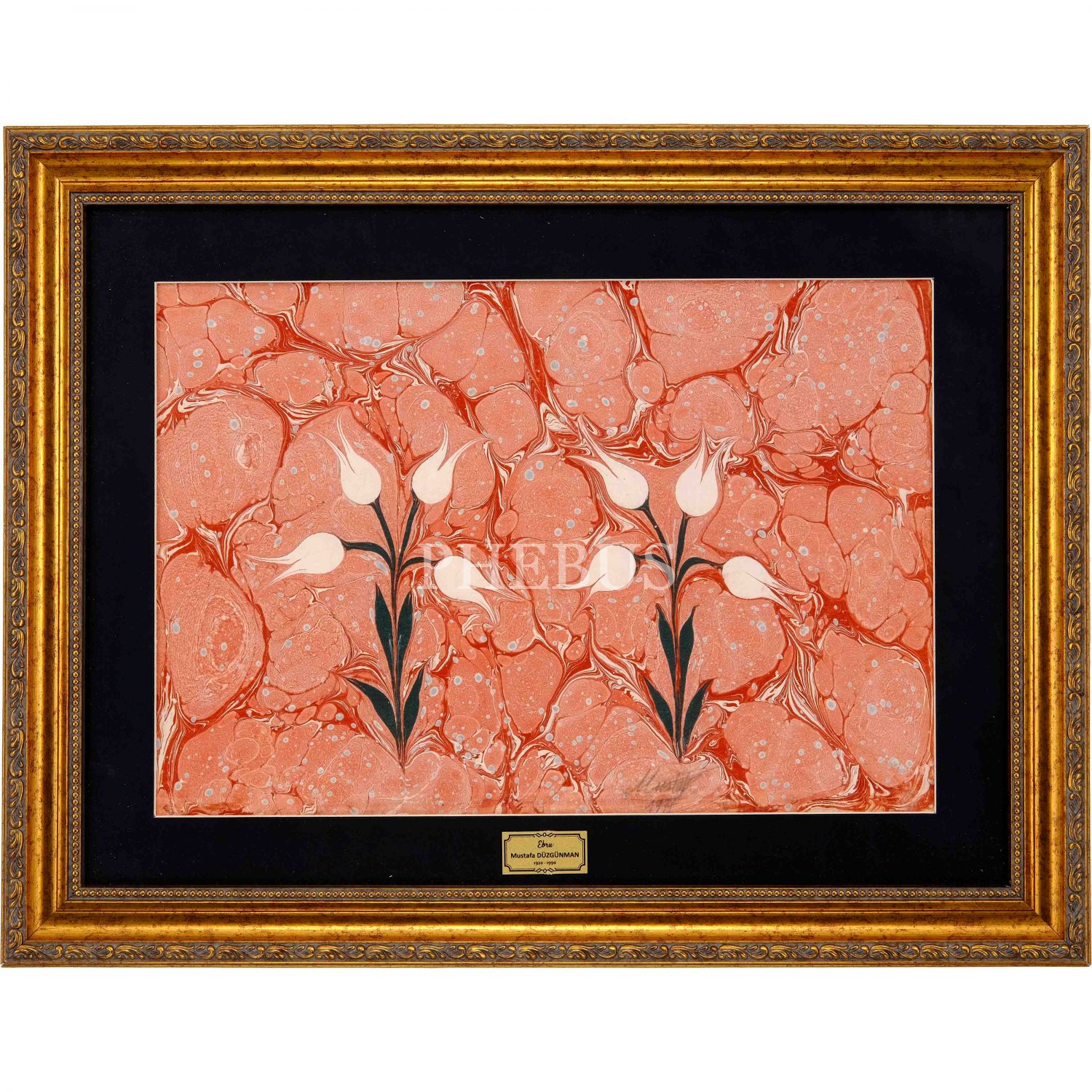 Mustafa Düzgünman imzalı çift lale ebrusu, ebru ölçü: 48x33 cm, 57x42 cm...