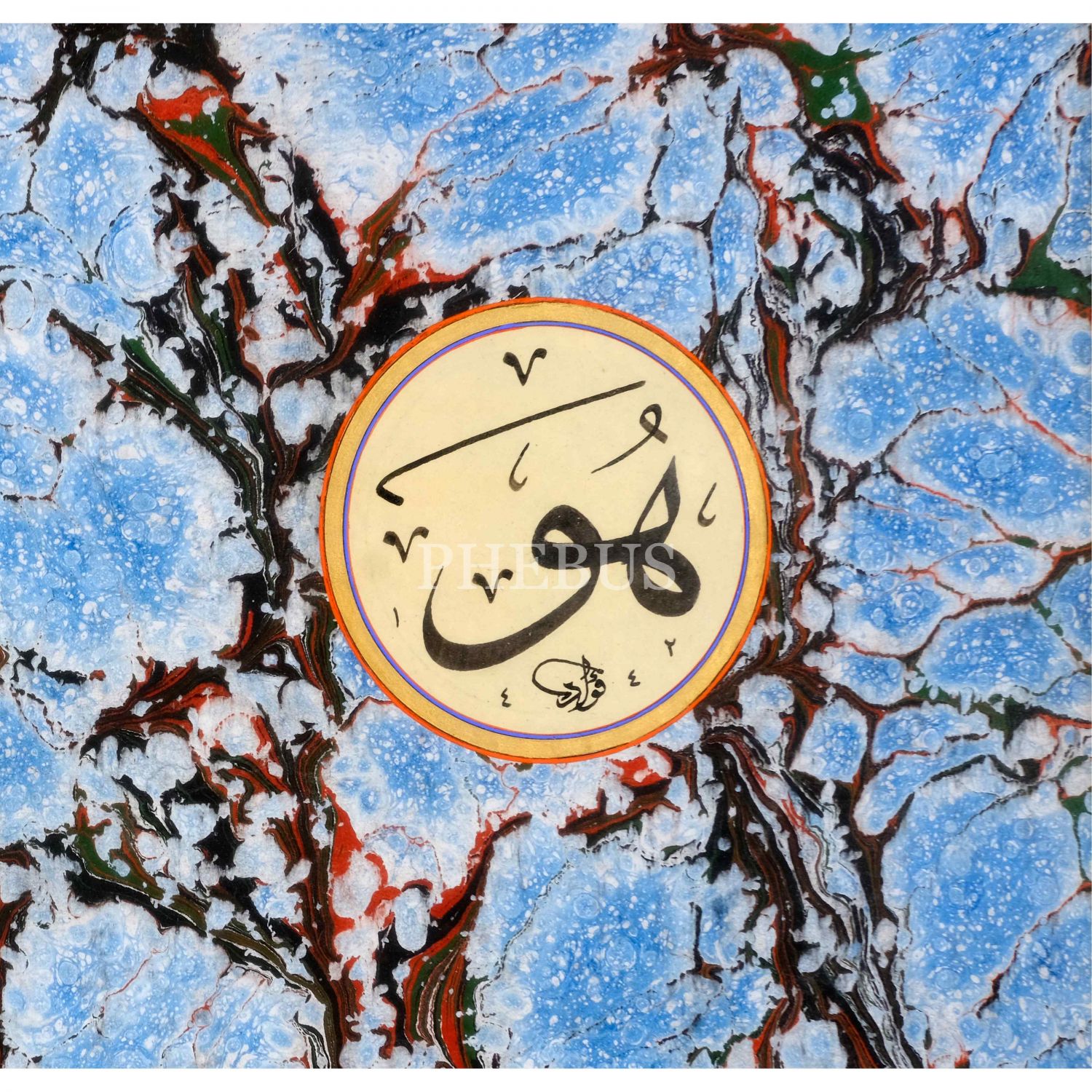 Fuat (Başar) ketebeli sülüs "Hû" ve ebru, 1442 tarihli, yazı çapı: 6 cm, ebru ölçü: 48x27 cm, çerçeve ölçü: 67x45 cm...
